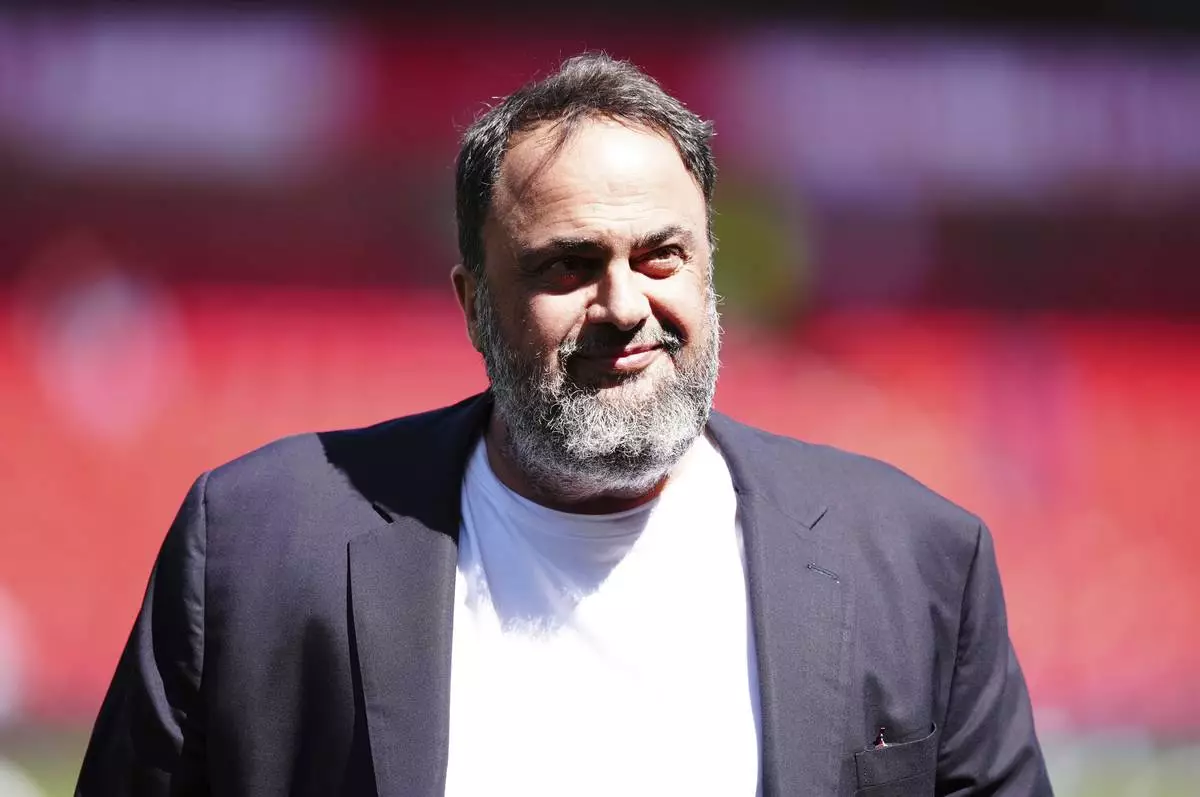 Nottingham Forest owner Evangelos Marinakis walks before a Premier League soccer match against Leicester at the City Ground in Nottingham, England, Sunday May 11, 2025. (Mike Egerton/PA via AP)