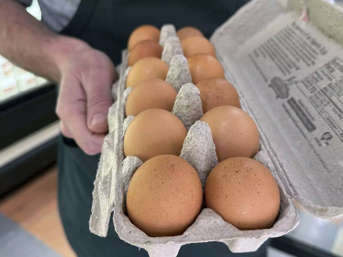 FILE - Joe Trimble, owner of Encinal Market, holds an open carton of eggs in Alameda, Calif., on Tuesday, Feb. 11, 2025. (AP Photo/Terry Chea, File)
