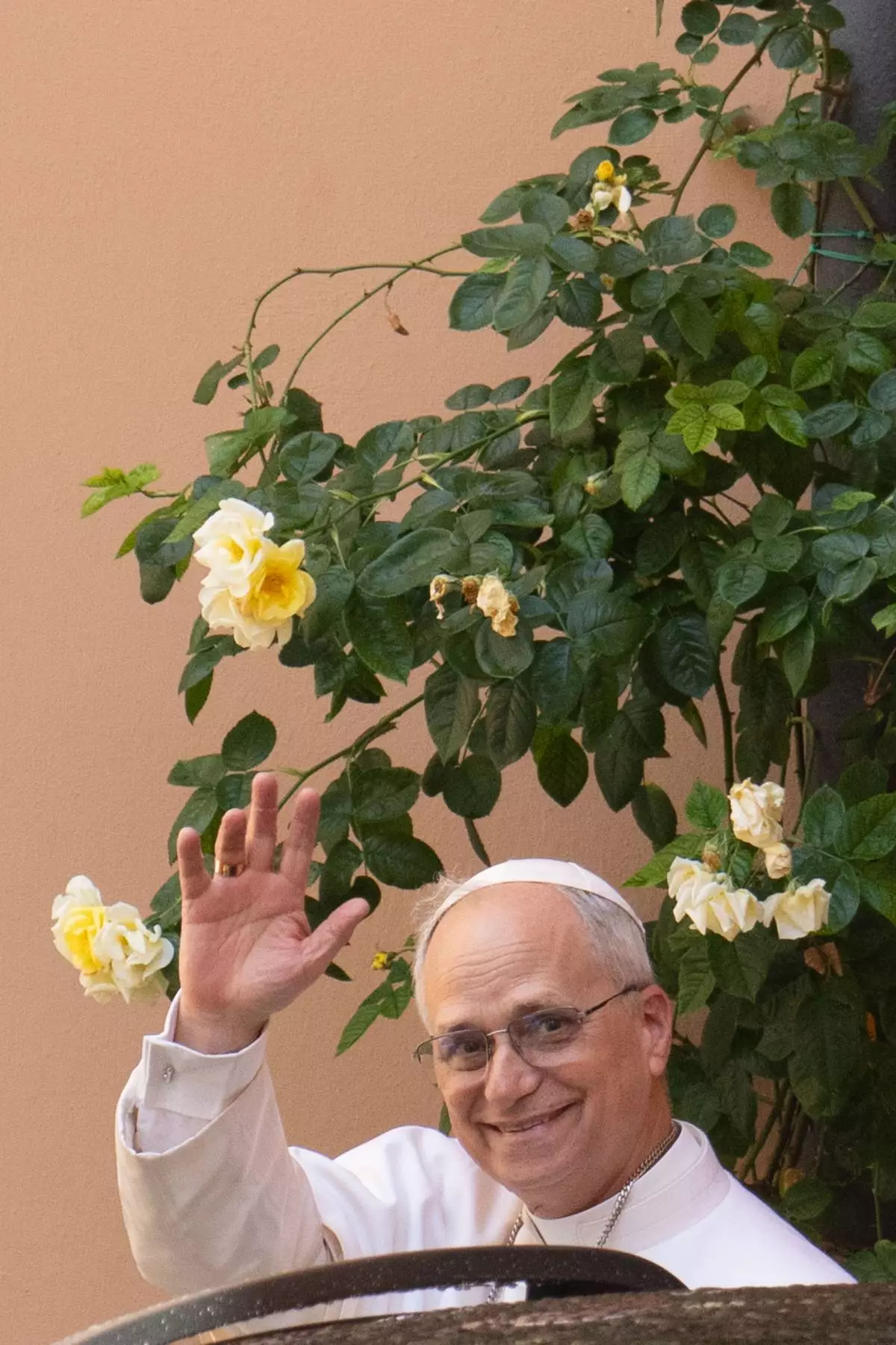 Pope Leo XIV leaves the Augustinian General House in Rome after a visit on Tuesday, May 13, 2025. (AP Photo/Domenico Stinellis)