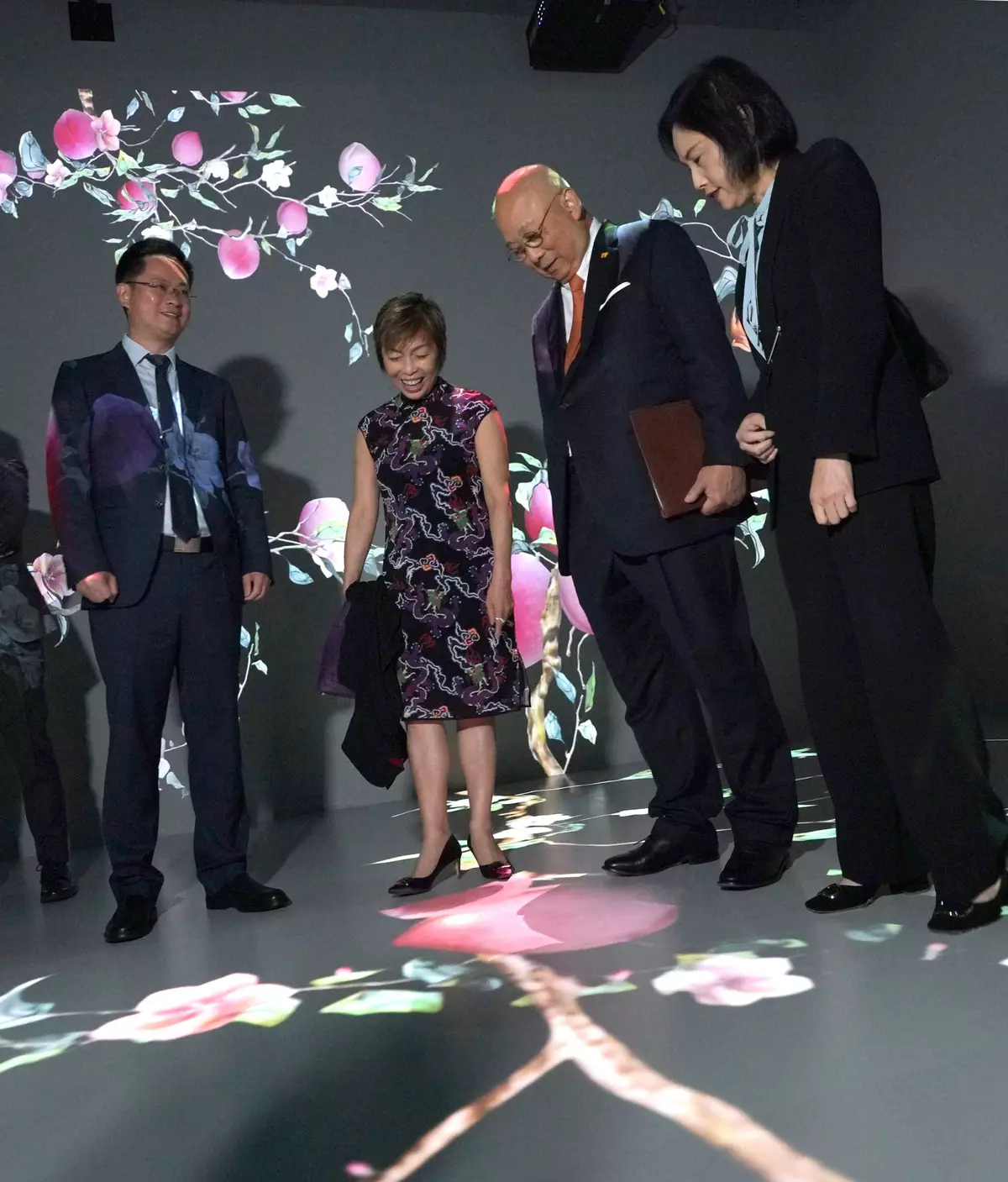Luo Xianliang, Deputy Director of the Palace Museum (centre); Leo Kung, Chairman of the Board of the Hong Kong Palace Museum (2nd left); Ann Kung, Deputy Chairman of the Institute of Philanthropy and Trustee of The Hong Kong Jockey Club Charities Trust (2nd right); Betty Fung, Chief Executive Officer of the West Kowloon Cultural District Authority (1st left); and Dr Louis Ng, Museum Director of the Hong Kong Palace Museum (1st right) officiate at the “The Ways in Patterns: An Immersive Digital Exhibition from the Palace Museum” opening ceremony.
