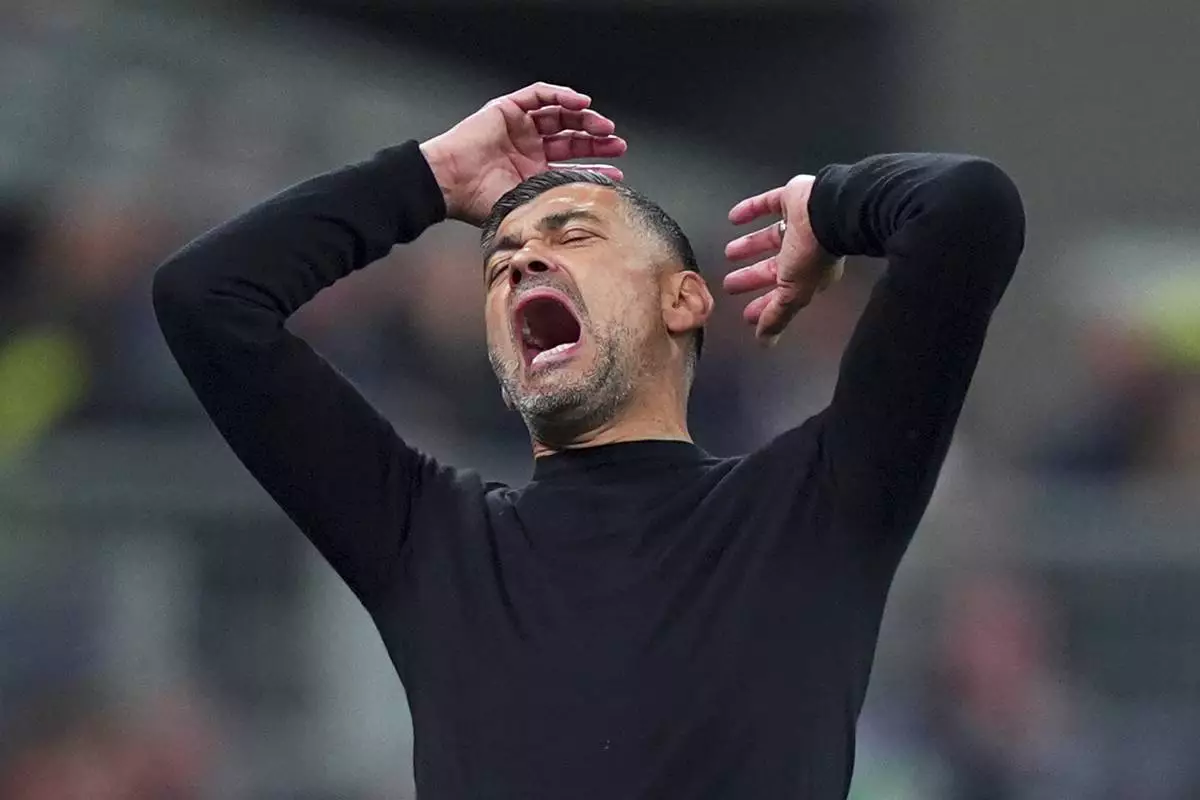 AC Milan's head coach Sergio Conceicao reacts during the Serie A soccer match between Milan and Bologna at San Siro Stadium in Milan, Italy, Friday May 9, 2025. (Spada/LaPresse via AP)