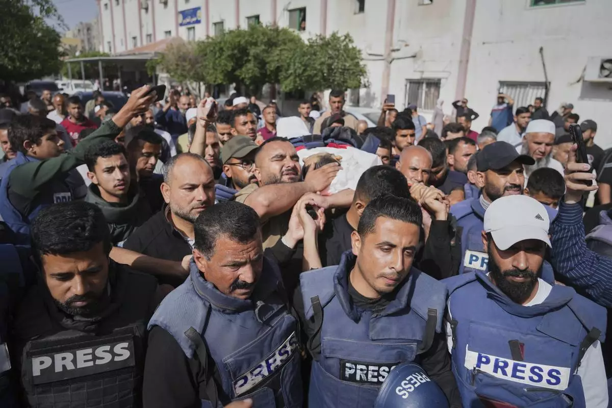 ADDS CONTEXT.- Mourners carry the body of Palestinian journalist Hassan Eslaiah, who was killed in an overnight Israeli strike on Nasser Hospital, with the Israeli military claiming he was targeted for being a Hamas militant involved in the October 7, 2023, attack on southern Israel that sparked the war, in Khan Younis, southern Gaza Strip, Tuesday, May 13. (AP Photo/Jehad Alshrafi)