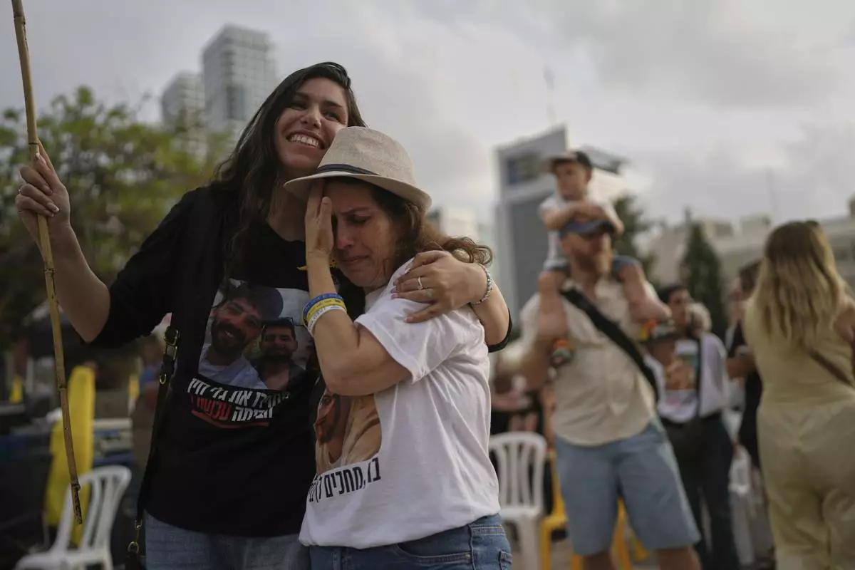 People watch a live broadcast of Israeli-American soldier Edan Alexander as he is released from Hamas captivity in Gaza, at a plaza known as the hostages square in Tel Aviv, Monday, May 12, 2025. Alexander was abducted during the Hamas-led attack on his base on October 7, 2023. (AP Photo/Oded Balilty)