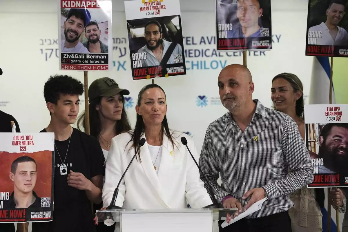 Yael and Adi Alexander, parents of former Israeli-American hostage Edan Alexander, an Israeli soldier who was freed from Hamas captivity yesterday, speak to journalists at Ichilov hospital where he is recovering, in Tel Aviv, Israel, Tuesday, May 13, 2025. (AP Photo/Ohad Zwigenberg)