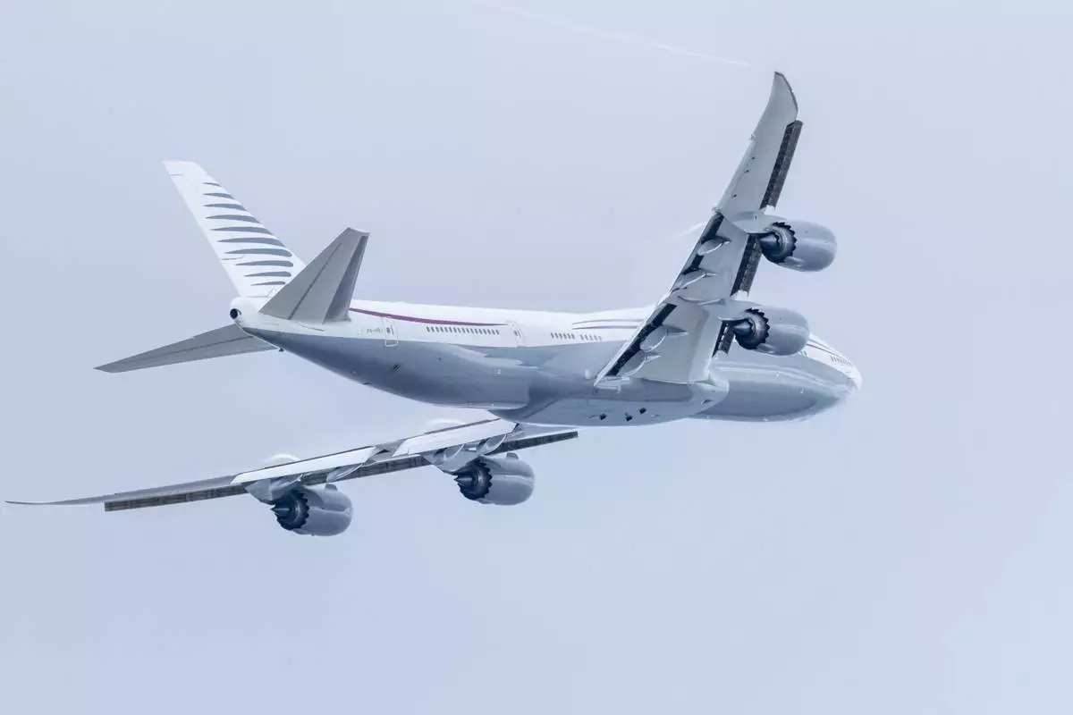 FILE - A 13-year-old private Boeing aircraft that President Donald Trump toured on Saturday to check out new hardware and technology features, and highlight the aircraft maker's delay in delivering updated versions of the Air Force One presidential aircraft, takes off from Palm Beach International Airport, Feb. 16, 2025, in West Palm Beach, Fla. (AP Photo/Ben Curtis, File)
