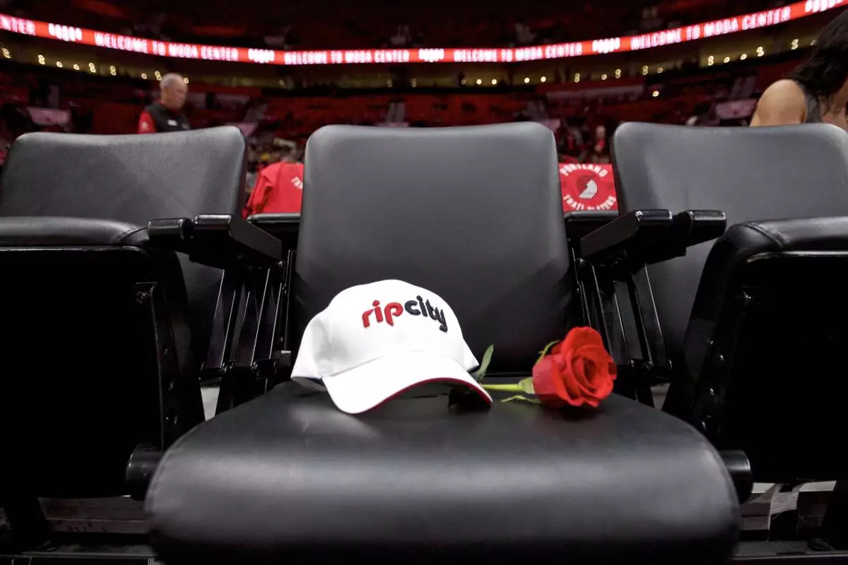 FILE - The seat for Trail Blazers owner Paul Allen has a rose and a hat placed on it before an NBA basketball game in Portland, Ore., Oct. 18, 2018. (AP Photo/Craig Mitchelldyer, file)