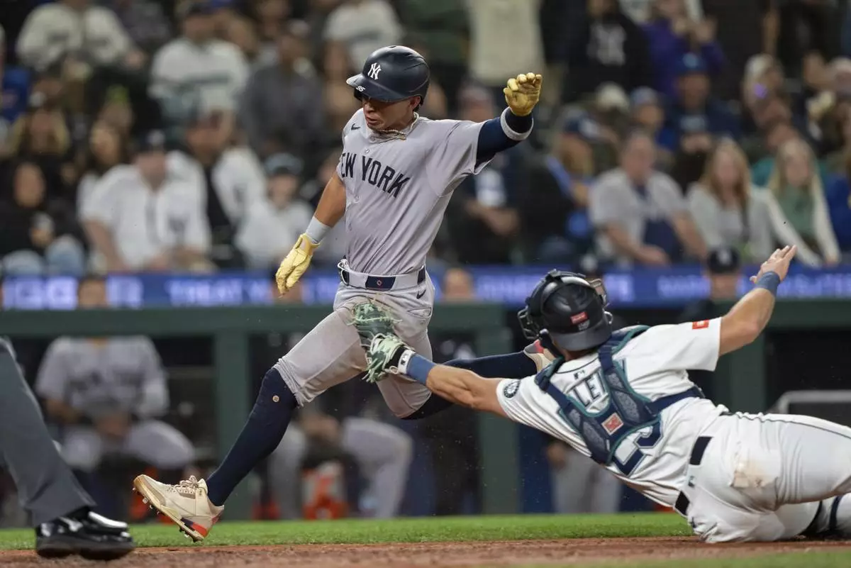 New York Yankees' Oswaldo Cabrera scores a run ahead of a tag by Seattle Mariners catcher Cal Raleigh during the ninth inning of a baseball game, Monday, May 12, 2025, in Seattle. (AP Photo/Stephen Brashear)