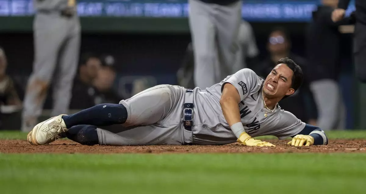 New York Yankees' Oswaldo Cabrera reacts after injuring his leg while scoring a run during the ninth inning of a baseball game against the Seattle Mariners, Monday, May 12, 2025, in Seattle. (AP Photo/Stephen Brashear)