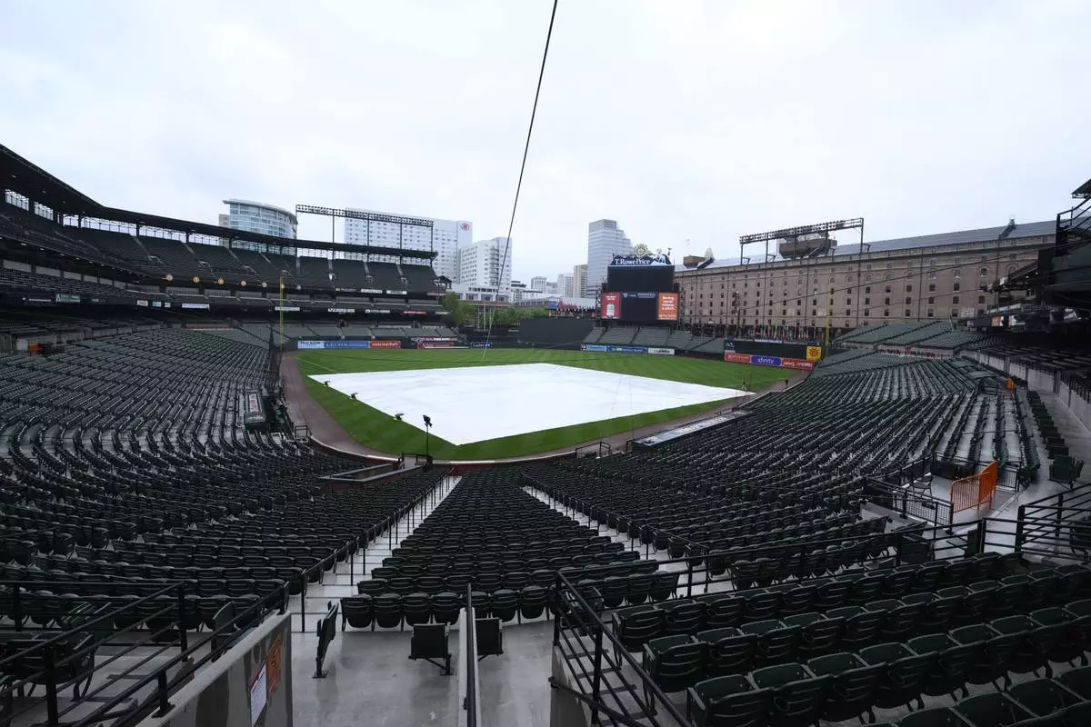 The tarp covers the infield as the baseball game between the Baltimore Orioles and Minnesota Twins was postponed due to weather, Tuesday, May 13, 2025, in Baltimore, and will be made up as part of a doubleheader Wednesday. (AP Photo/Nick Wass)