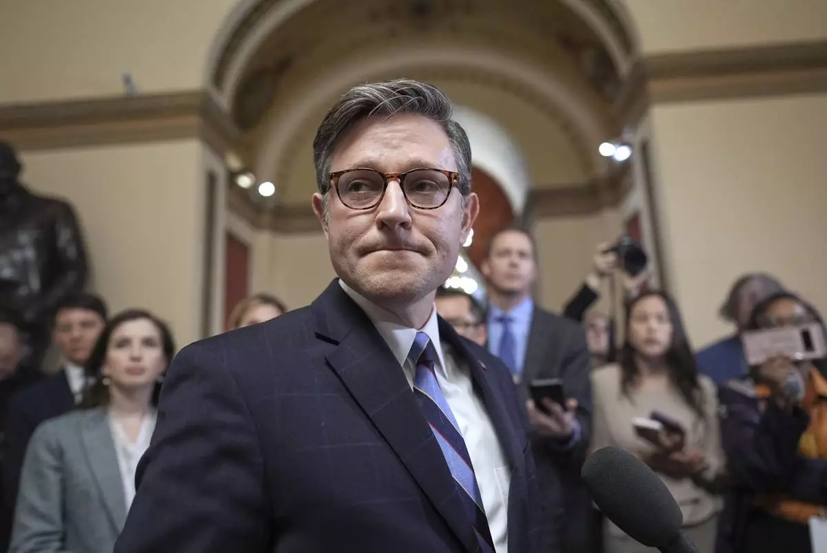 FILE - Speaker of the House Mike Johnson, R-La., talks to reporters just after House Republicans narrowly approved their budget framework, at the Capitol in Washington, April 10, 2025. (AP Photo/J. Scott Applewhite, File)
