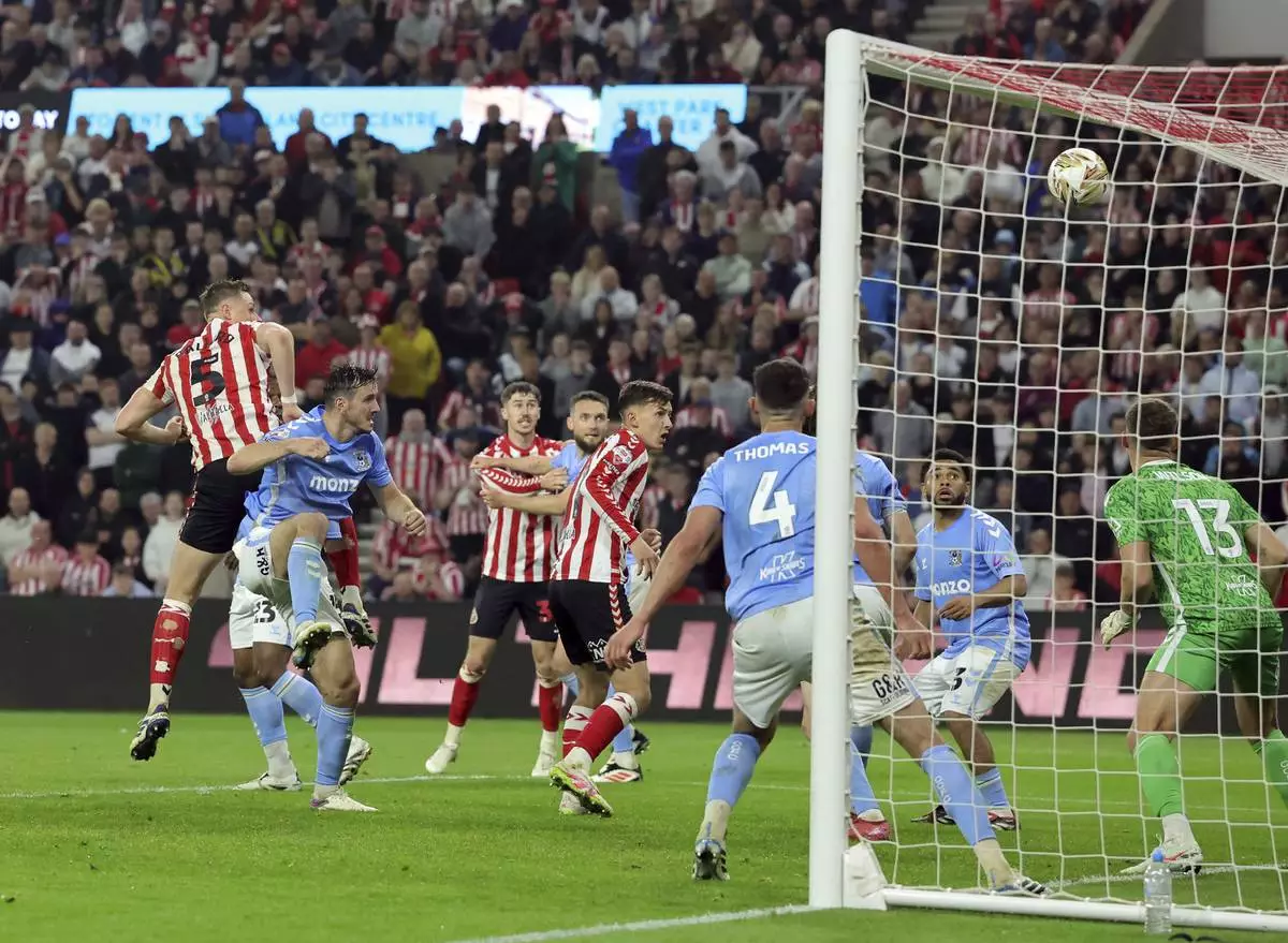 Sunderland's Daniel Ballard (5) scores their side's first goal of the game against Coventry during extra time in a Sky Bet Championship play-off semifinal, second leg soccer match at the Stadium of Light, Tuesday May 13, 2025, in Sunderland, England. (Steve Welsh/PA via AP)