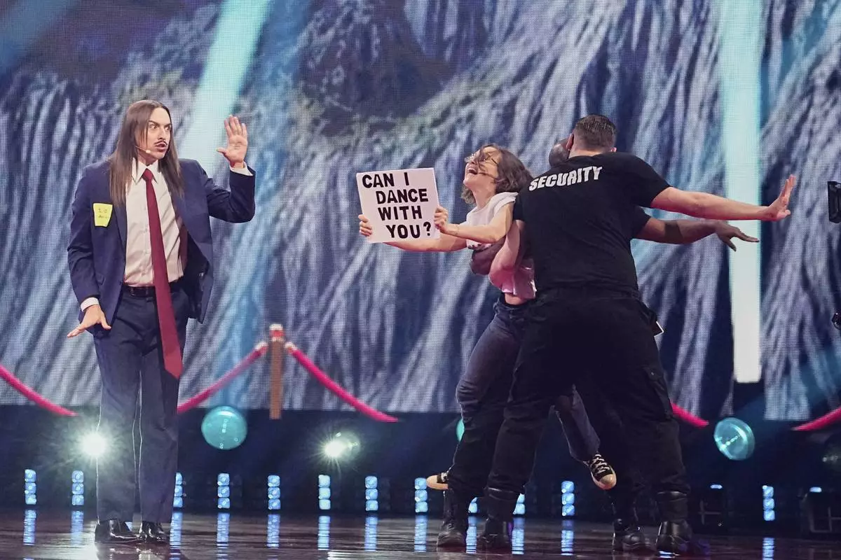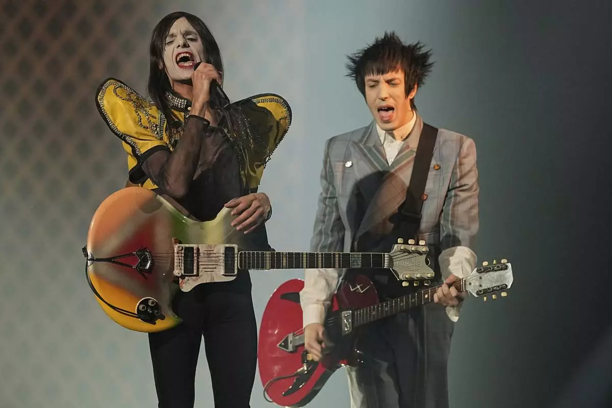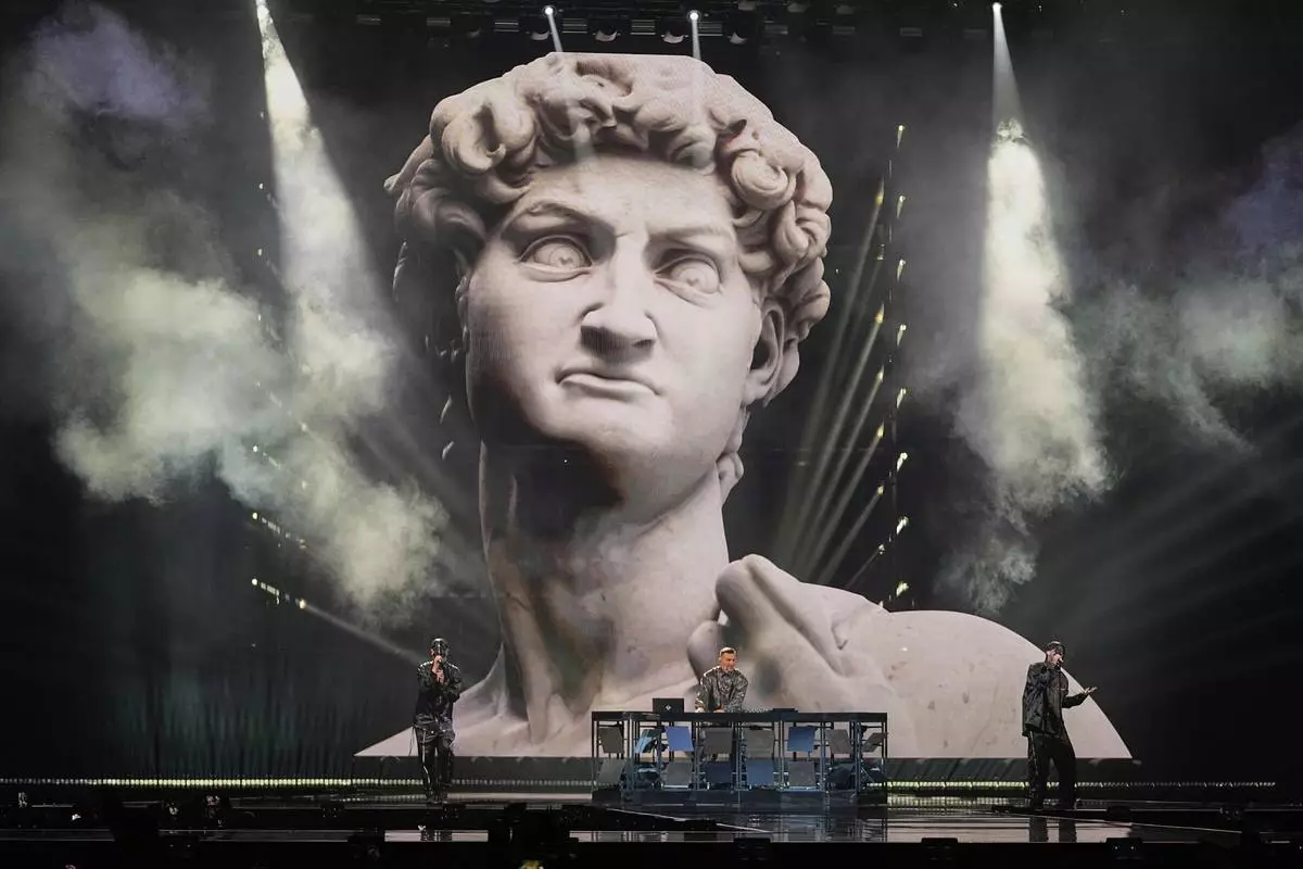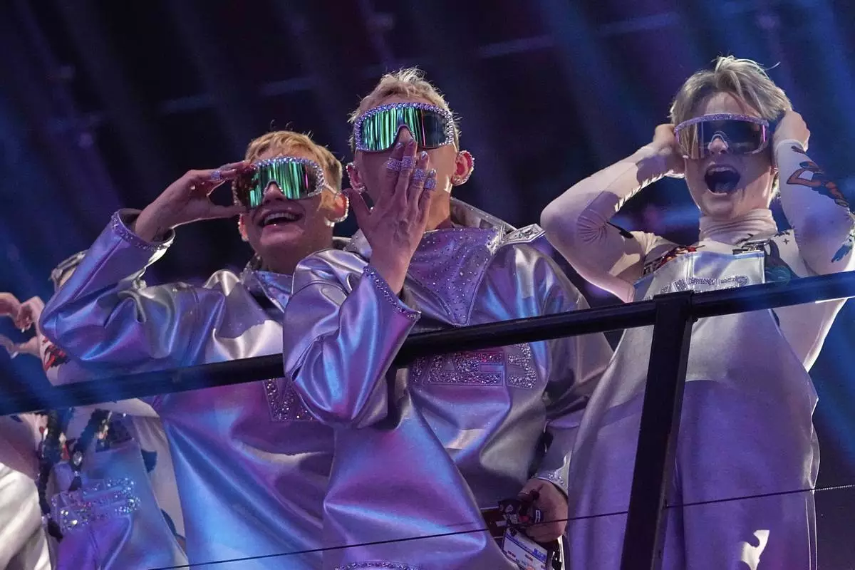 KAJ from Sweden performs the song "Bara Bada Bastu" during the first semi-final of the 69th Eurovision Song Contest, in Basel, Switzerland, Tuesday, May 13, 2025. (AP Photo/Martin Meissner)