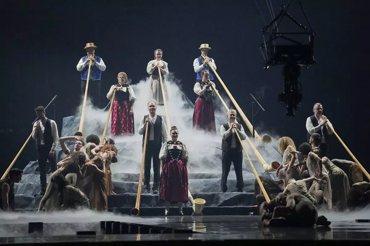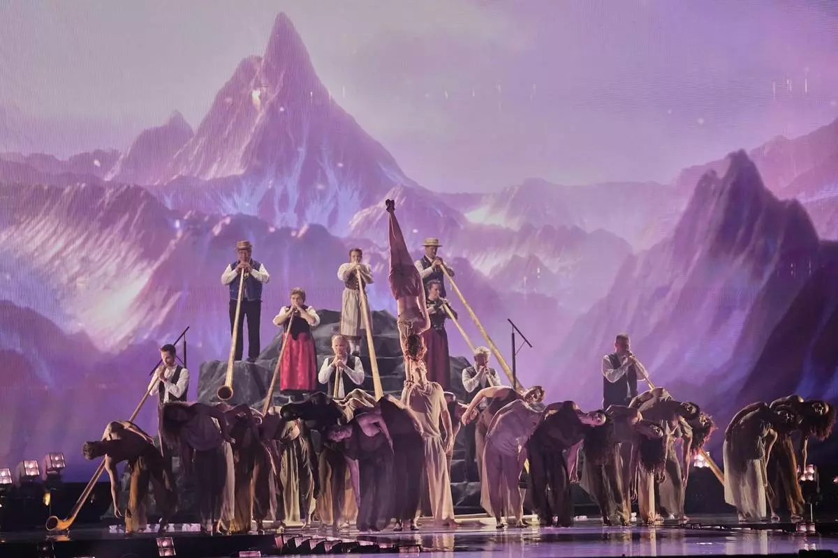 Traditional Swiss mountain horns open the show ahead of the start of the first semi-final of the 69th Eurovision Song Contest, in Basel, Switzerland, Tuesday, May 13, 2025. (AP Photo/Martin Meissner)