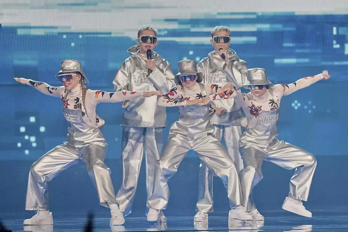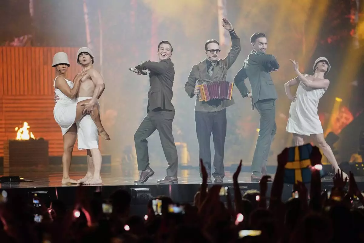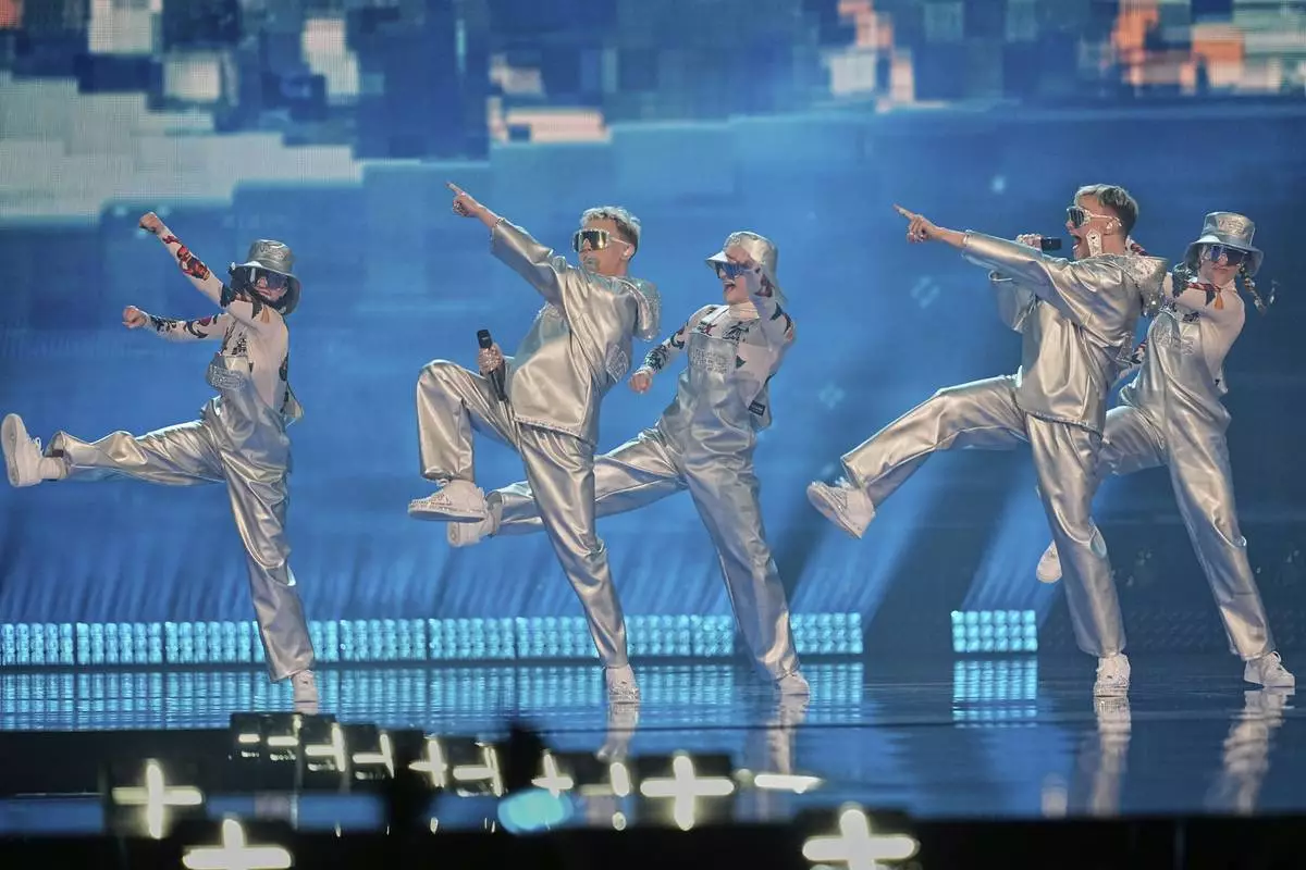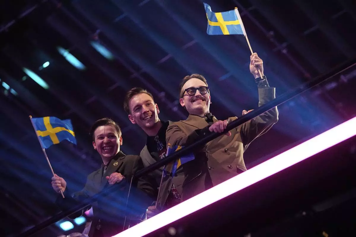 KAJ from Sweden who performed "Bara Bada Bastu" celebrate after progressing through the first semi-final to the final of the 69th Eurovision Song Contest,in Basel, Switzerland, Tuesday, May 13, 2025. (AP Photo/Martin Meissner)