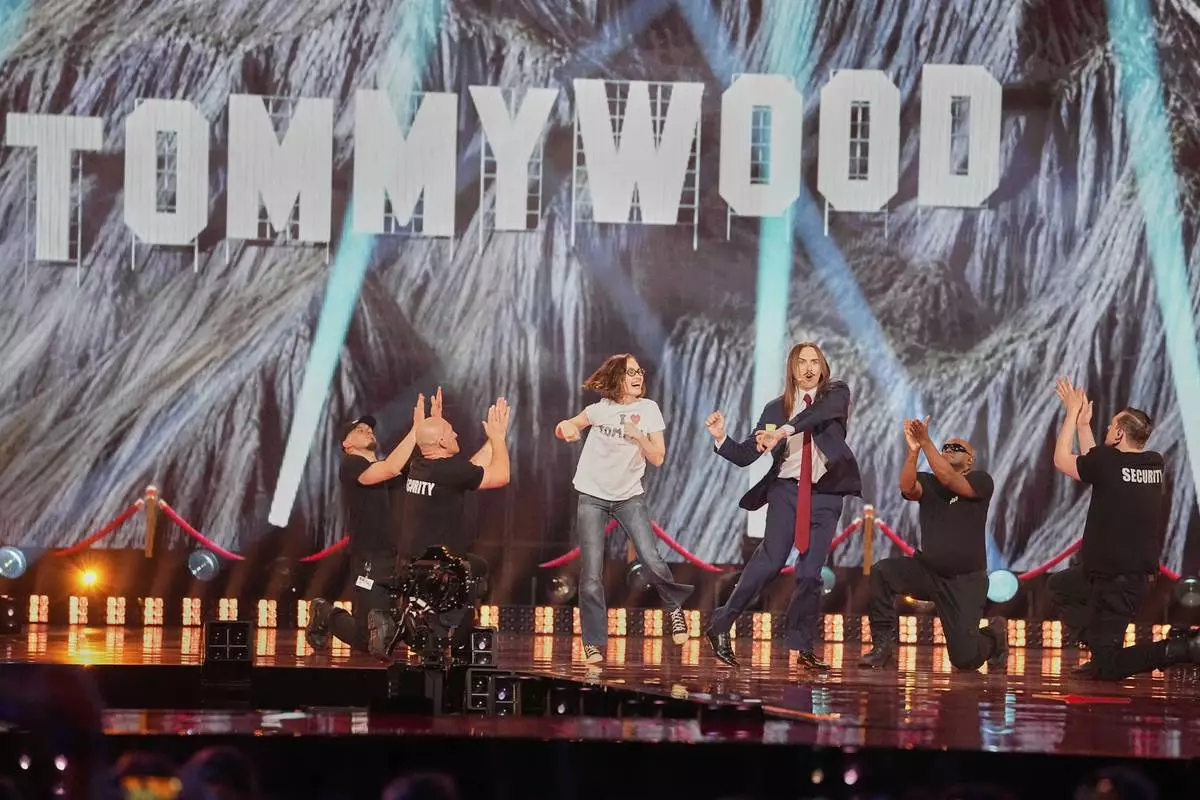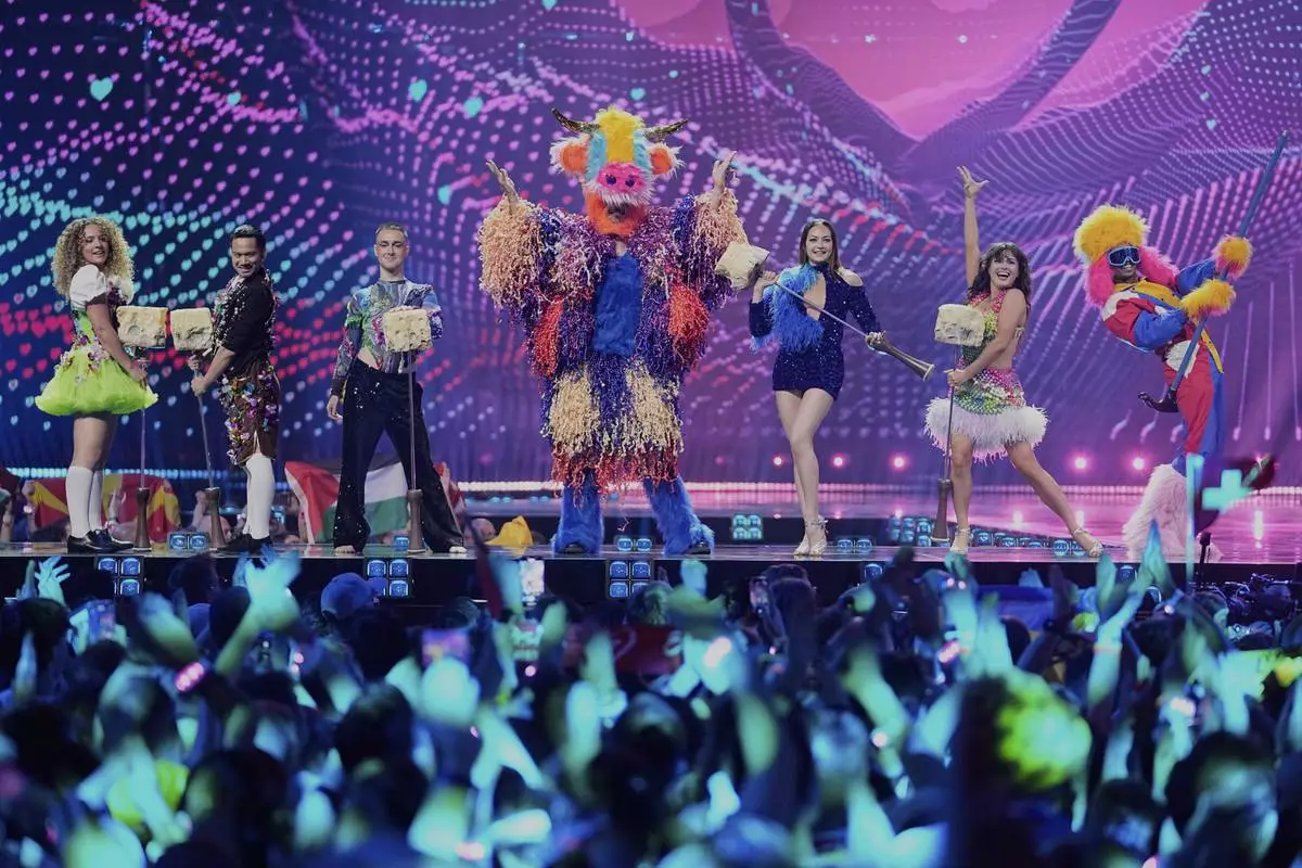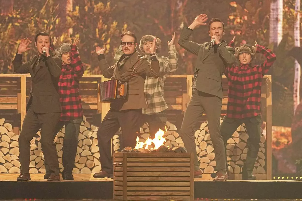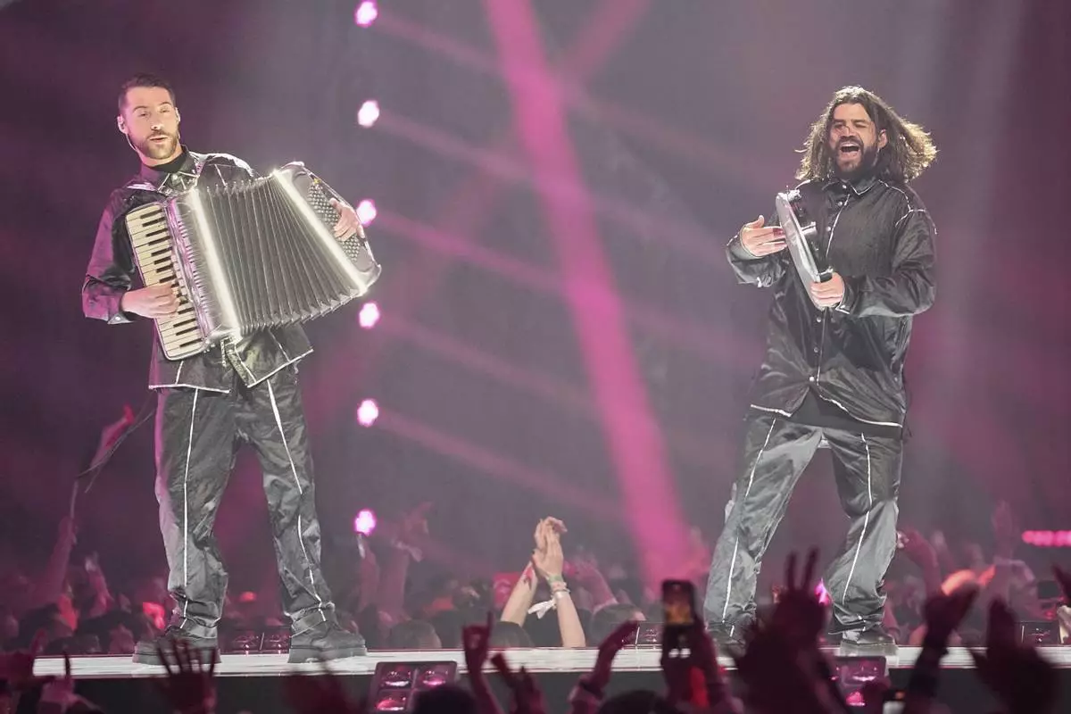 KAJ from Sweden who performed "Bara Bada Bastu" celebrate after progressing through the first semi-final to the final of the 69th Eurovision Song Contest,in Basel, Switzerland, Tuesday, May 13, 2025. (AP Photo/Martin Meissner)