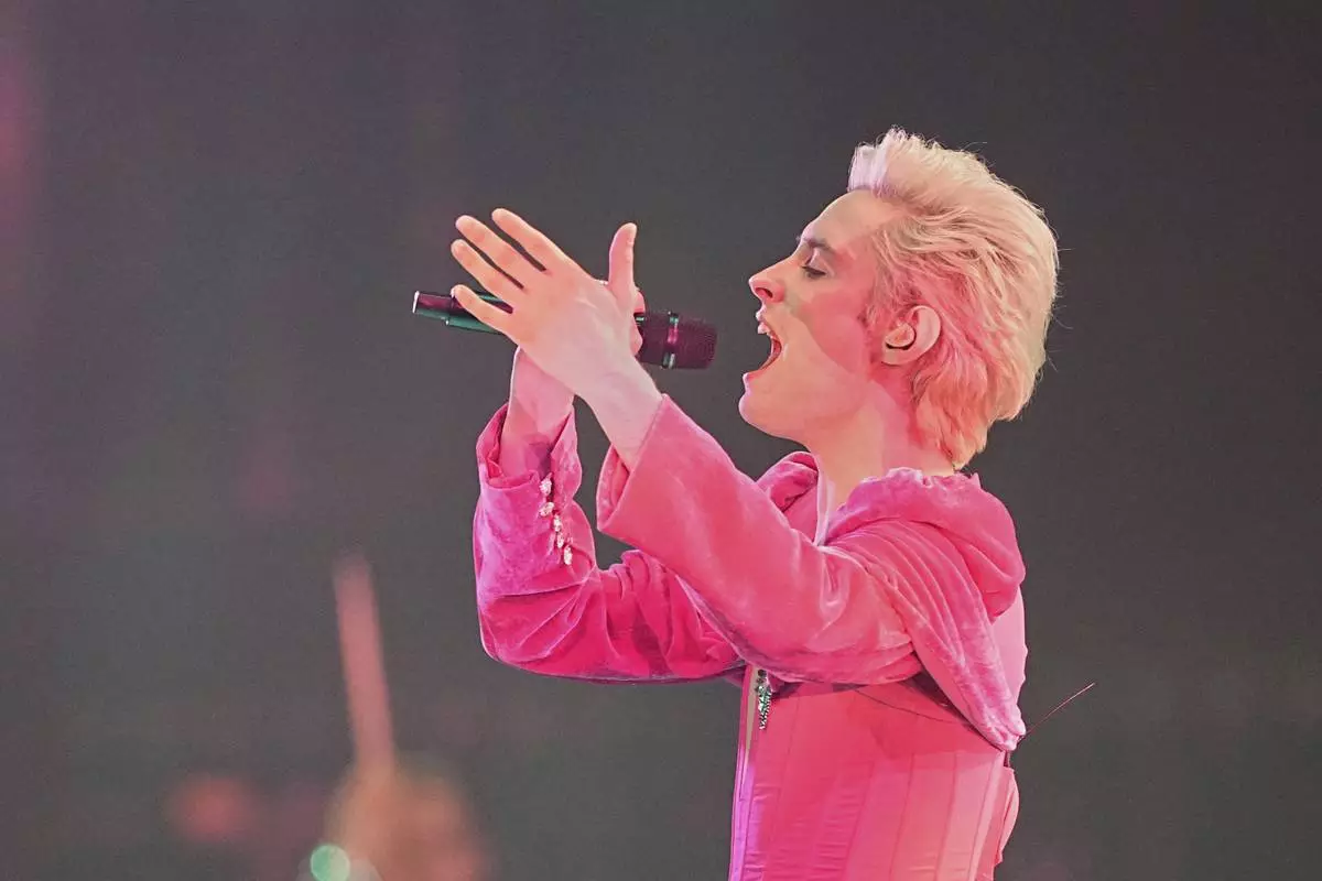 Red Sebastian from Belgium performs the song "Strobe Lights" during the first semi-final of the 69th Eurovision Song Contest, in Basel, Switzerland, Tuesday, May 13, 2025. (AP Photo/Martin Meissner)