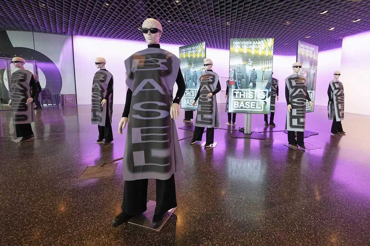 An art installation welcomes music fans at the Eurovision village ahead of the first semi-final of the 69th Eurovision Song Contest, in Basel, Switzerland, Tuesday, May 13, 2025. (AP Photo/Martin Meissner)