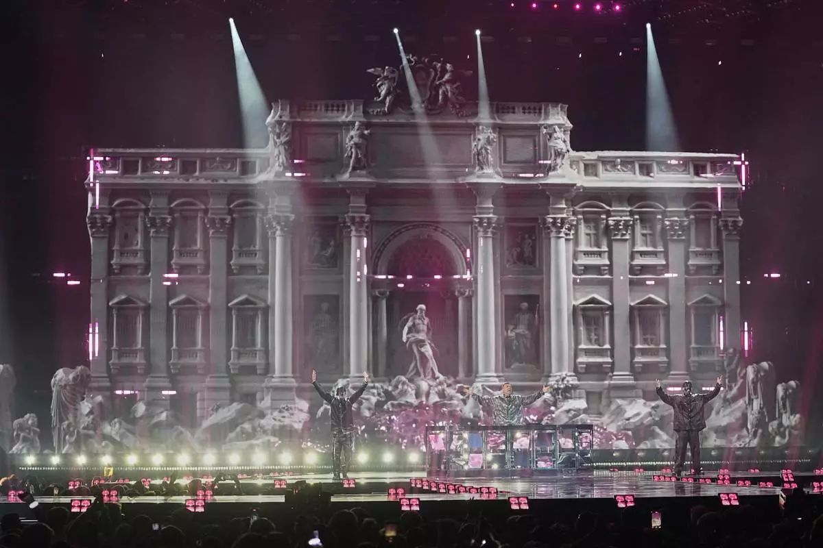 Shkodra Elektronike from Albania performs the song "Zjerm" during the first semi-final of the 69th Eurovision Song Contest, in Basel, Switzerland, Tuesday, May 13, 2025. (AP Photo/Martin Meissner)