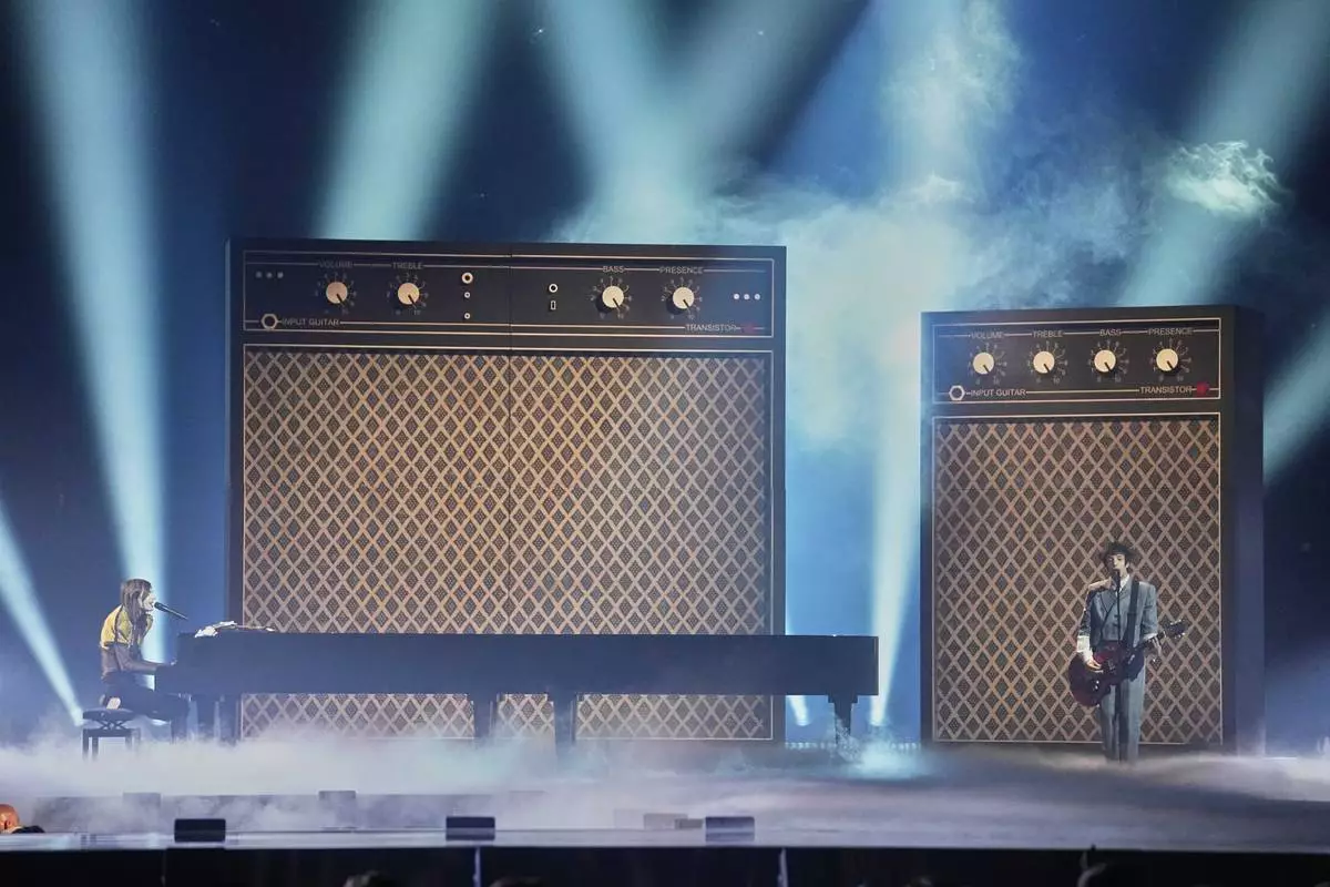 Lucio Corsi from Italy performs the song "Volevo Essere Un Duro" during the first semi-final of the 69th Eurovision Song Contest, in Basel, Switzerland, Tuesday, May 13, 2025. (AP Photo/Martin Meissner)