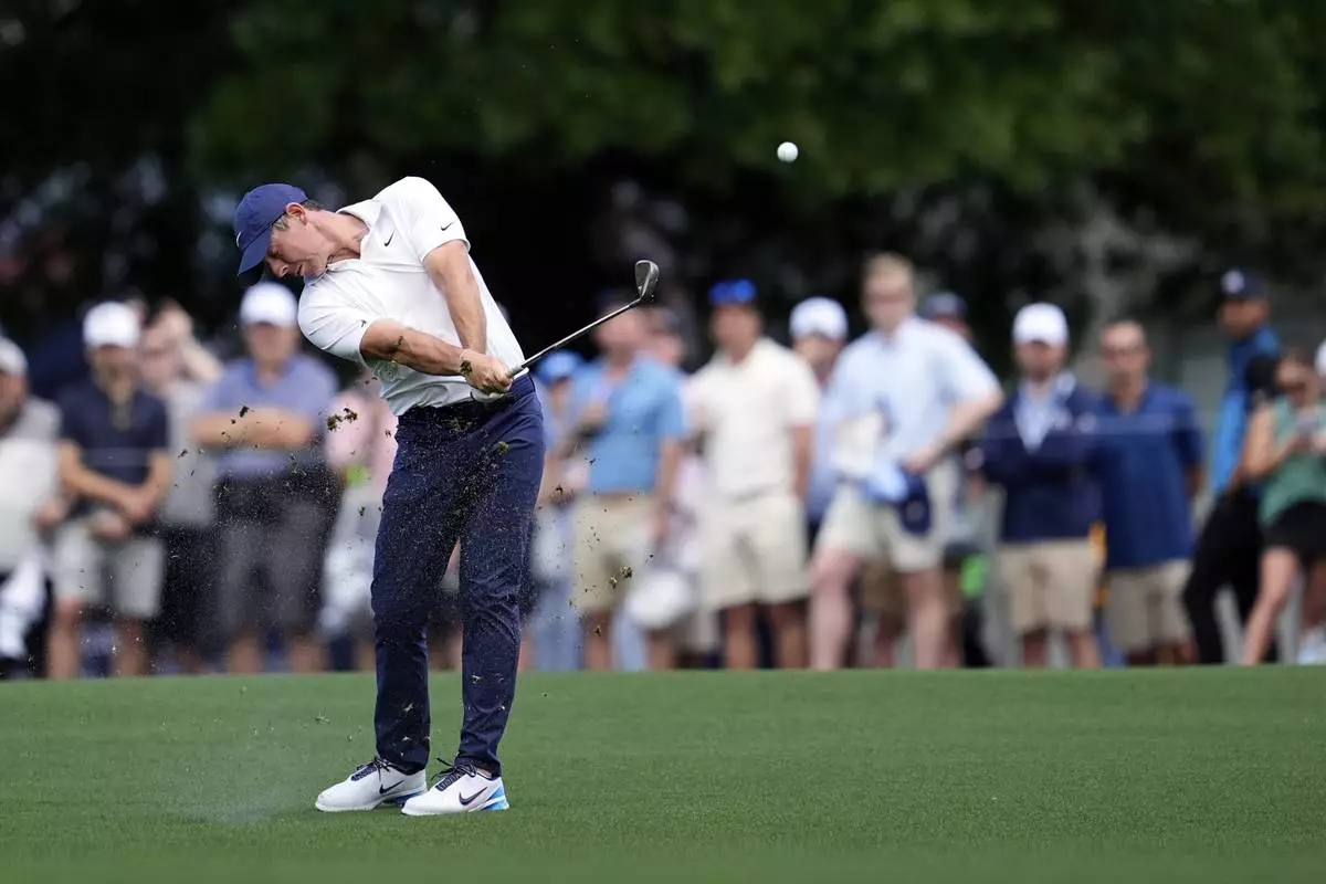 Rory McIlroy, of Northern Ireland, hits from the fairway on the first hole during a practice round for the PGA Championship golf tournament at the Quail Hollow Club, Tuesday, May 13, 2025, in Charlotte, N.C. (AP Photo/George Walker IV)