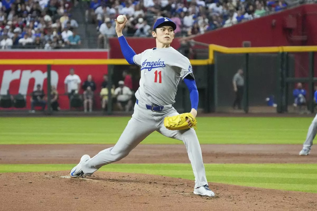 Los Angeles Dodgers pitcher Roki Sasaki, of Japan, throws against the Arizona Diamondbacks during the second inning of a baseball game Friday, May 9, 2025, in Phoenix. (AP Photo/Darryl Webb)