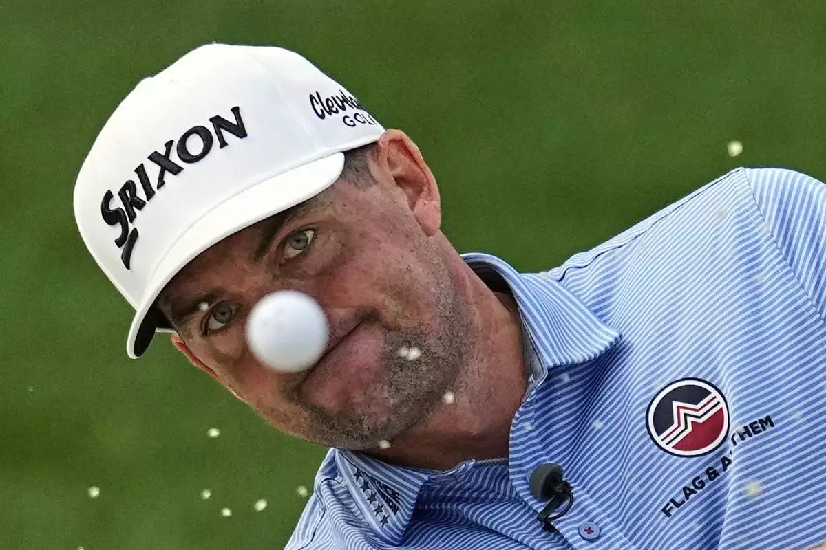 Keegan Bradley hits from the bunker on the 13th hole during a practice round for the PGA Championship golf tournament at the Quail Hollow Club, Tuesday, May 13, 2025, in Charlotte, N.C. (AP Photo/David J. Phillip)