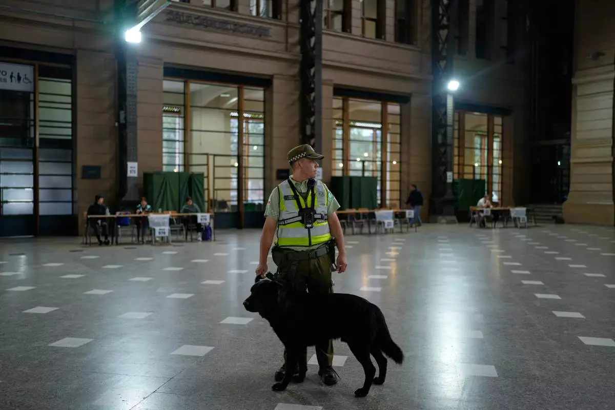 Police guard the Mapocho station polling station during the presidential runoff election in Santiago, Chile, Sunday, Dec. 14, 2025. (AP Photo/Natacha Pisarenko)
