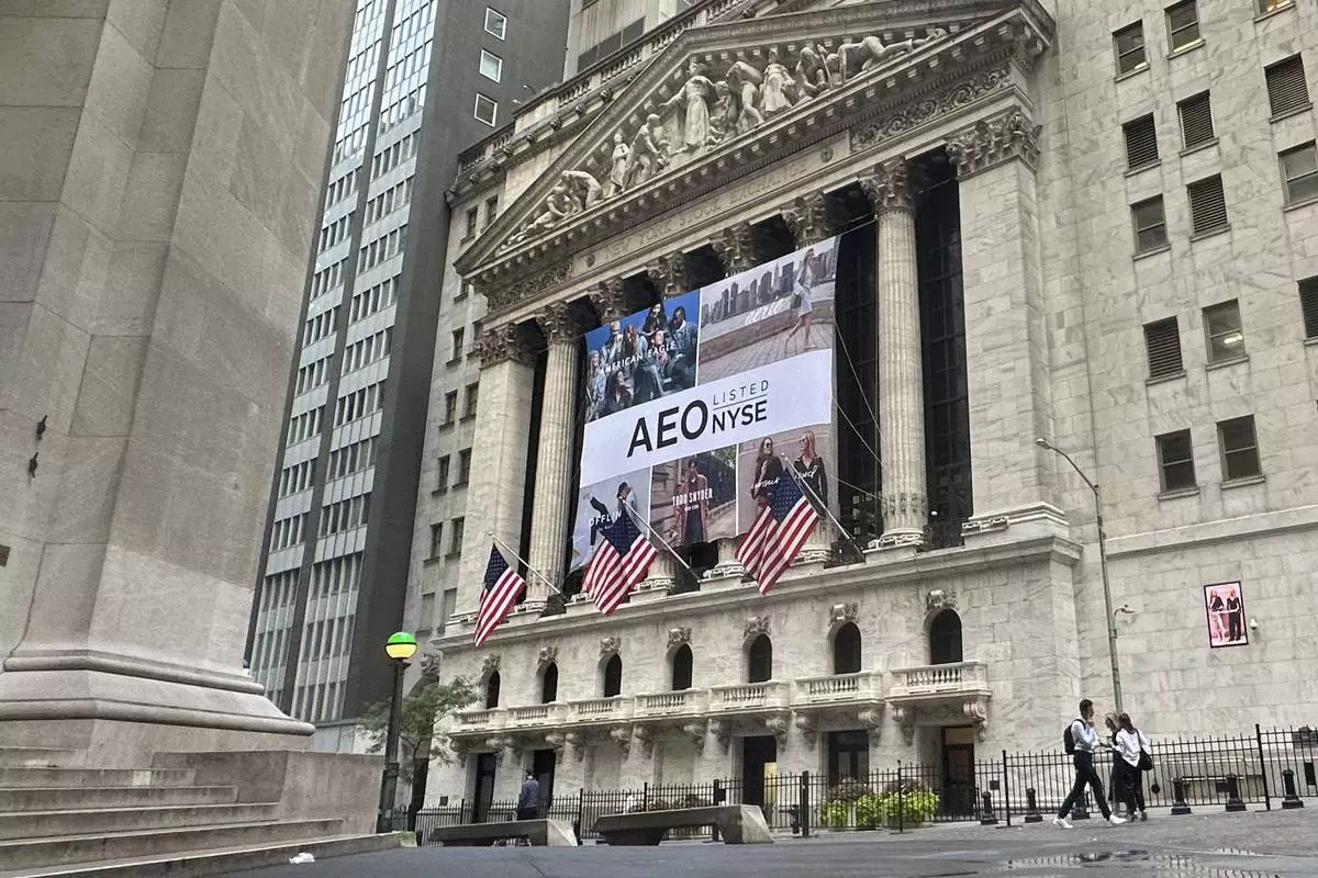 FILE - The New York Stock Exchange, with a banner for American Eagle Outfitters, is shown on Tuesday, Sept. 17, 2024, in New York. (AP Photo/Peter Morgan, File)