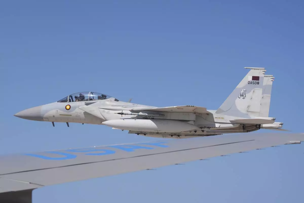 Qatar Emiri Air Force F-15s provide an honorary escort for Air Force One, carrying President Donald Trump, as it arrives in Doha, Qatar, Wednesday, May 14, 2025. (AP Photo/Alex Brandon)