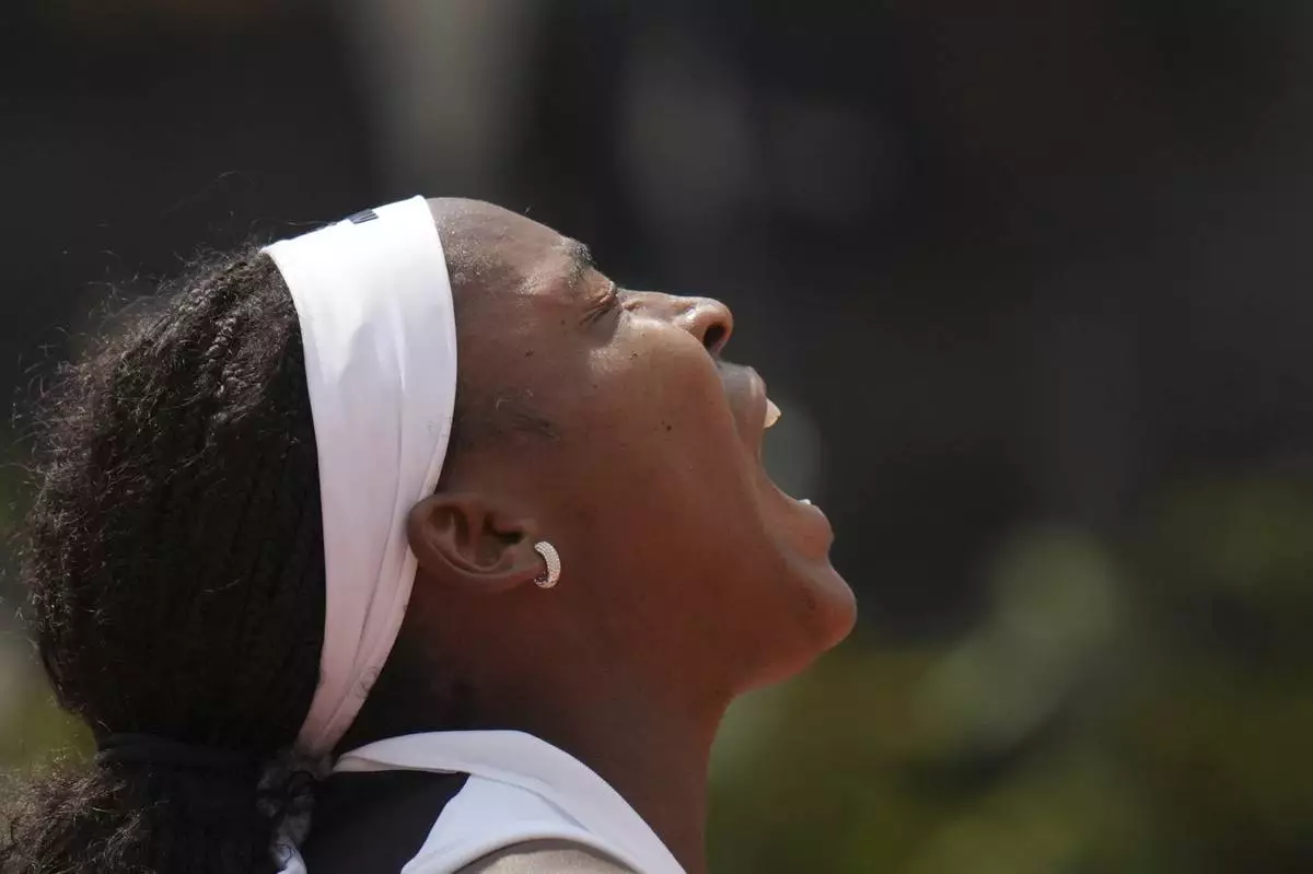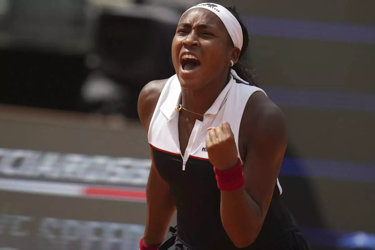United States' Coco Gauff celebrates after defeating Mirra Andreeva in their tennis match at the Italian Open at the Foro Italico, in Rome, Wednesday, May 14, 2025.(AP Photo/Alessandra Tarantino)