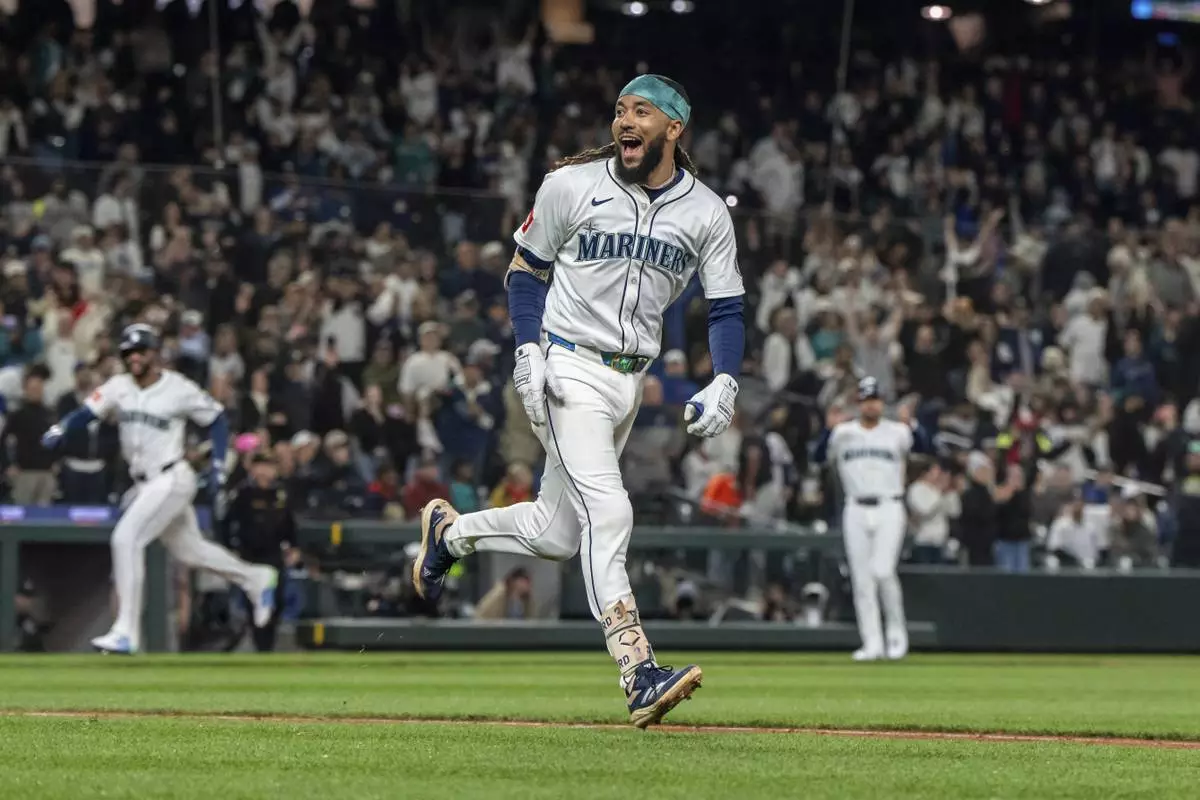 Seattle Mariners' J.P. Crawford celebrates after hitting and RBI-single during the eleventh inning of a baseball game against the New York Yankees, Tuesday, May 13, 2025, in Seattle. (AP Photo/Stephen Brashear)