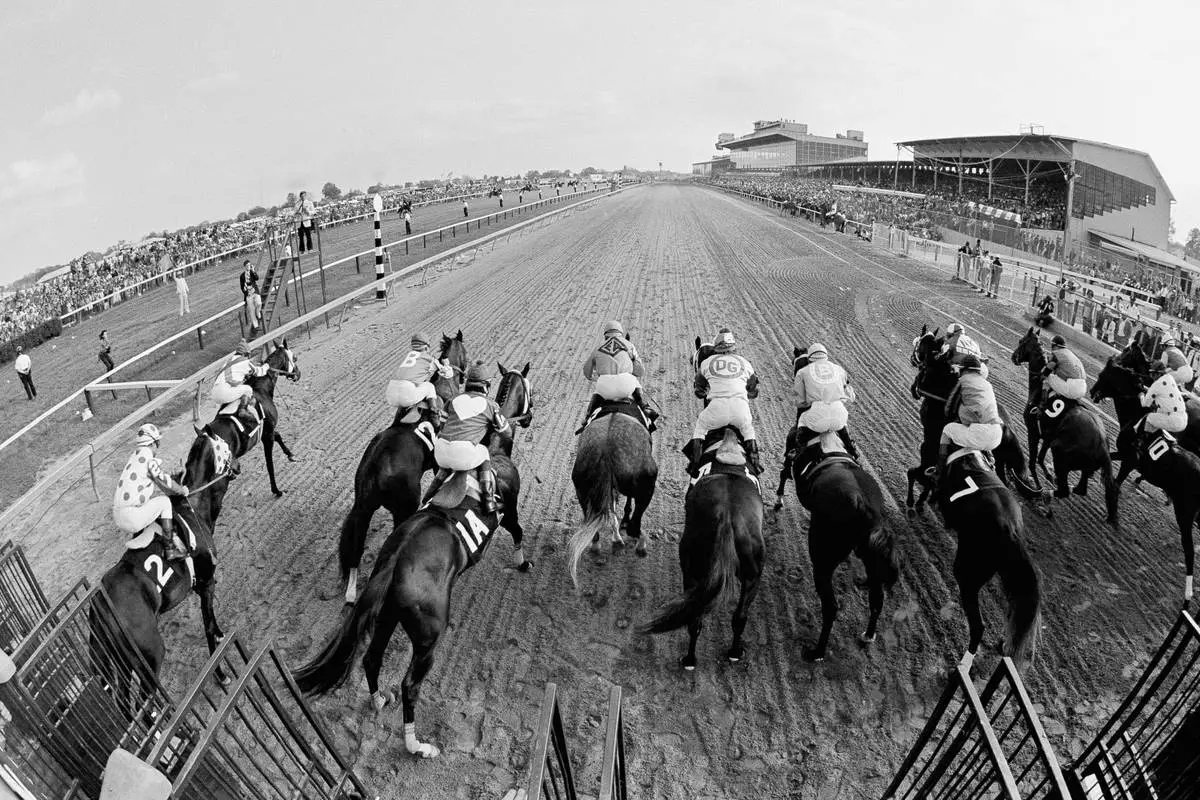 FILE - The field of thirteen horses break from the starting gate at the start of the 106th running of the Preakness Stakes at Pimlico Race Track in Baltimore,May 16, 1981. (AP Photo/File)