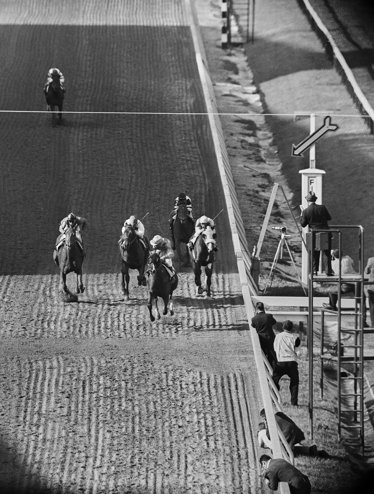 FILE - Northern Dancer, third from right, crosses the finish line in the 88th running of the Preakness Stakes horse race at Pimlico Race Course in Baltimore, Md., May 16, 1964. Northern Dancer was first adding a second win towards the Triple Crown after his Kentucky Derby victory. The other horses: The Scoundrel , second; Hill Rise, third; Quadrangle, fourth; Roman Brother, fifth; and Big Pete, sixth. (AP Photo/FIle)