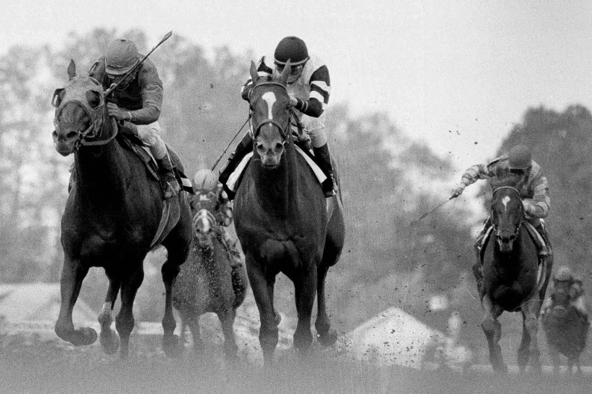 FILE - Affirmed, center, with Steve Cauthen in the irons, wins the 103rd running of the Preakness Stakes horse race at Pimlico Race Course in Baltimore, May 20, 1978. Alydar, left, was second. (AP Photo/File)