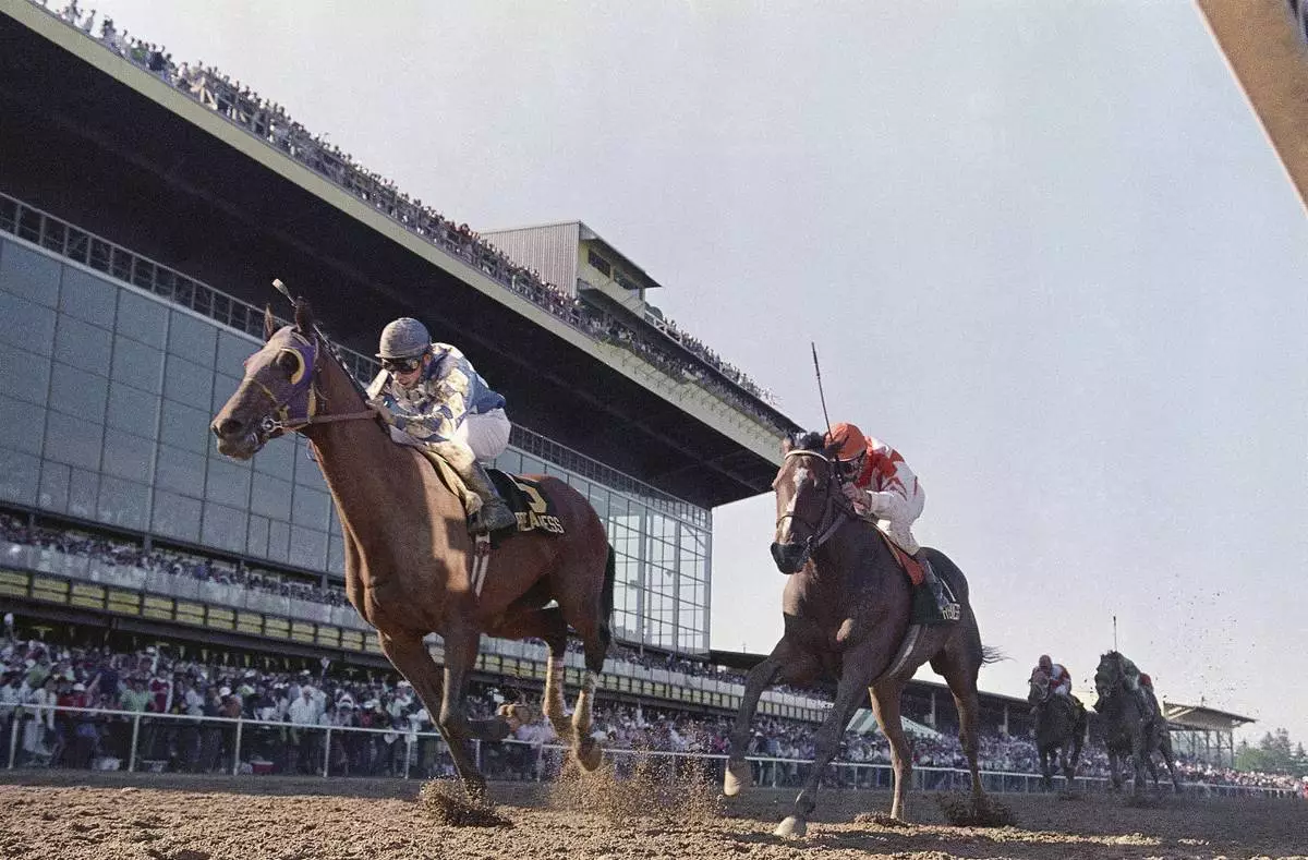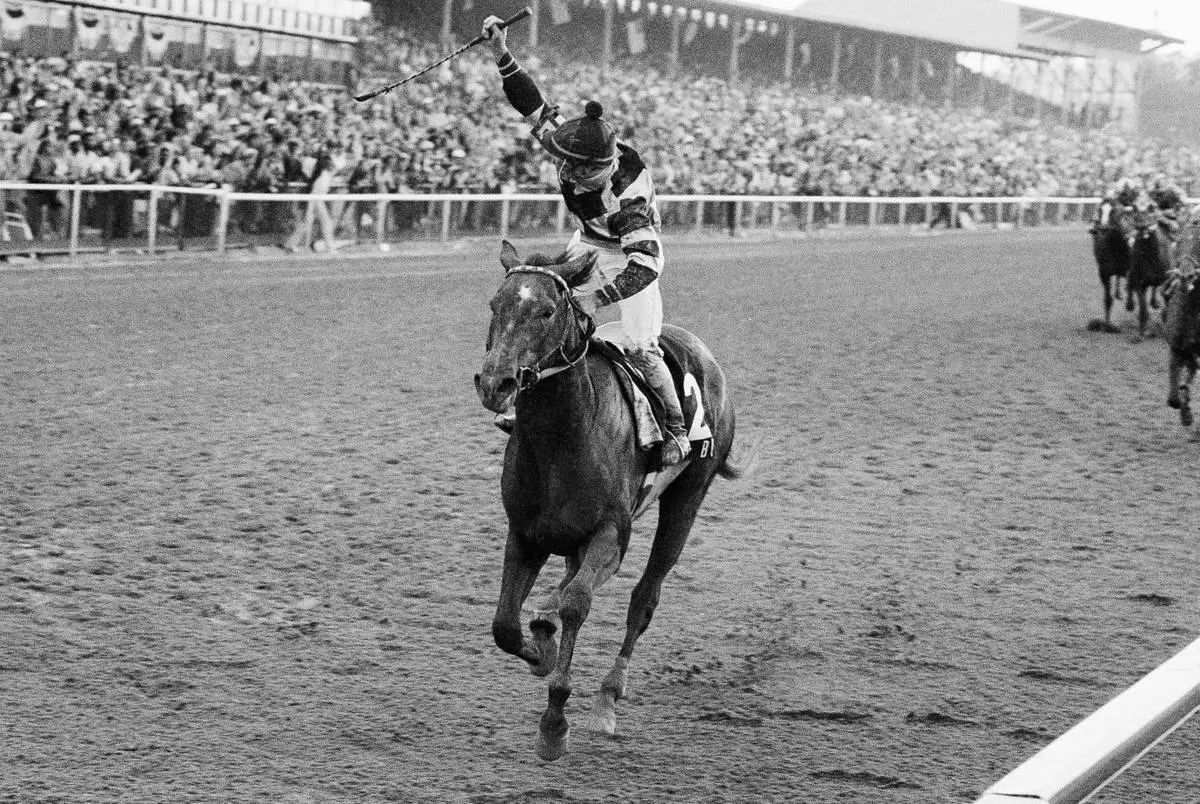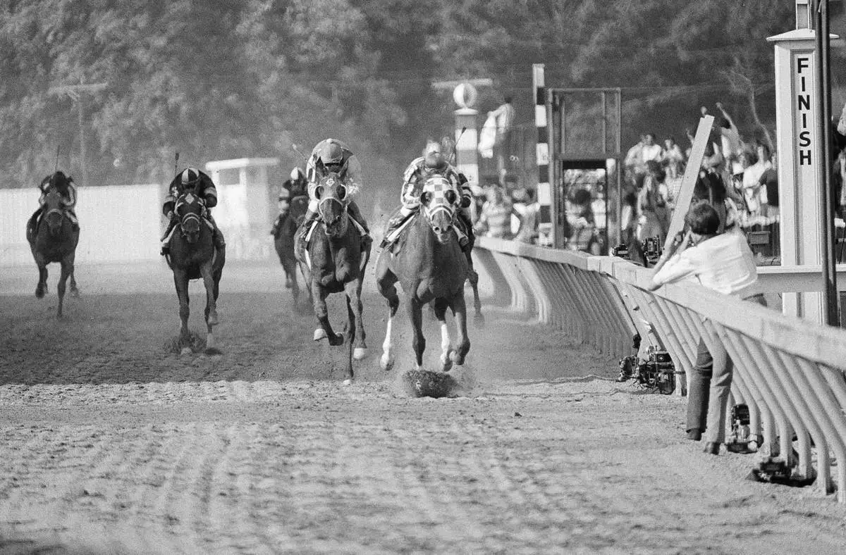 FILE - Seattle Slew (8), with jockey Jean Cruguet in the irons, stretches to cross the finish line ahead of Iron Constitution, right, and win the Preakness Stakes horse race at Pimlico Race Course in Baltimore, Saturday, May 21, 1977. (AP Photo/File)