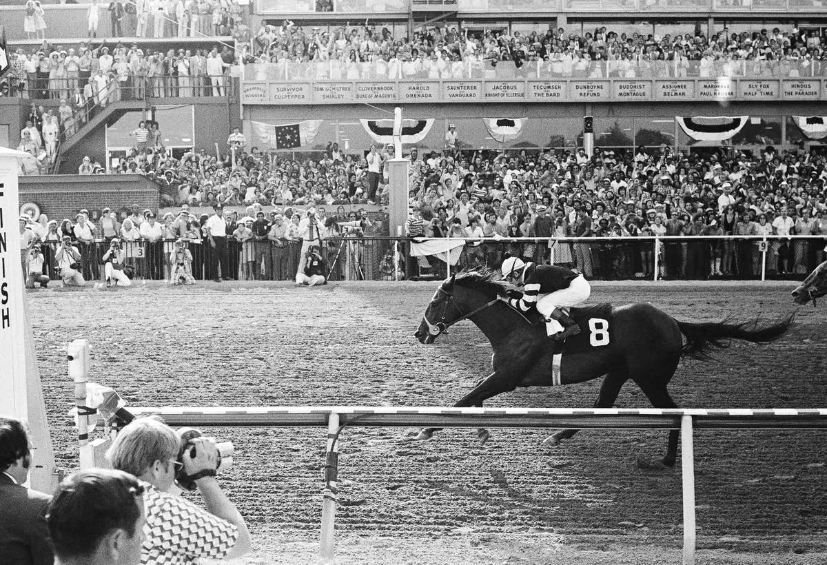 FILE - Secretariat on the rail, with Ron Turcotte up, wins the 98th running of the Preakness Stakes horse race, May 19, 1973, in Baltimore. (AP Photo/File)