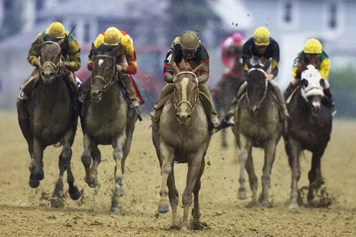 FILE - Red Bullet (4) with jockey Jerry Bailey aboard, center, breaks away from the field in the final stretch to win the 125th running of the Preakness Stakes at Pimlico Race Course in Baltimore, Saturday, May 20, 2000. (AP Photo/Roberto Borea, File)