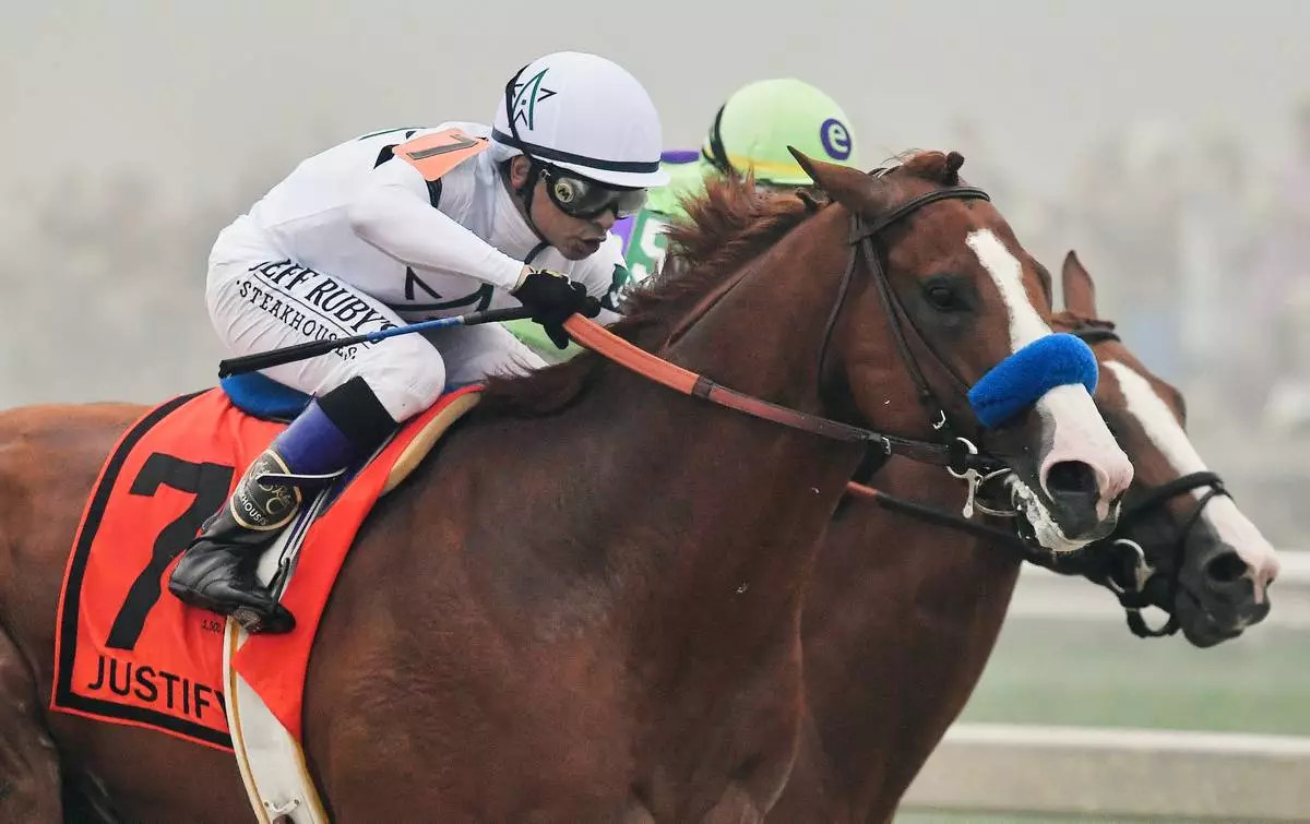 FILE - Justify (7), with Mike Smith aboard, edges ahead of Good Magic, with Jose Ortiz atop, down the stretch to win the 143rd Preakness Stakes horse race at Pimlico race track, Saturday, May 19, 2018, in Baltimore. Justify won the race. (AP Photo/Tom Horan, File)