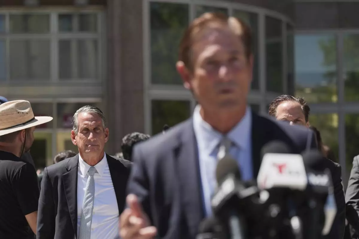 Bryan Freedman, an attorney representing family members of Erik and Lyle Menendez, left, looks on as Los Angeles County District Attorney Nathan Hochman speaks outside of the courthouse Friday, May 9, 2025, in Los Angeles. (AP Photo/Jae C. Hong)