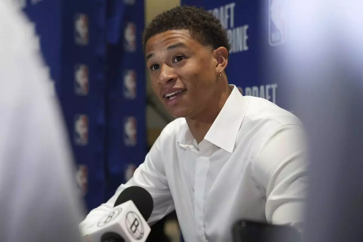 Carter Bryant talks to media at the 2025 NBA basketball Draft Combine in Chicago, Wednesday, May 14, 2025. (AP Photo/Nam Y. Huh)