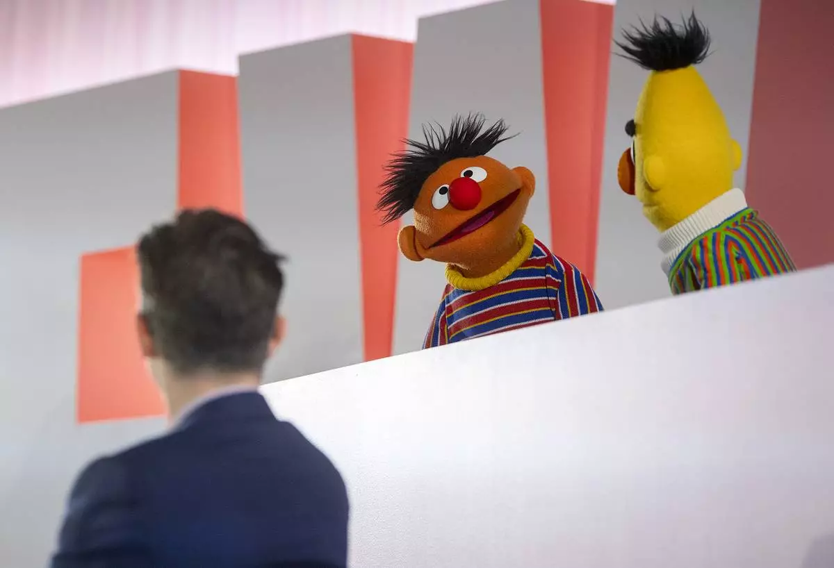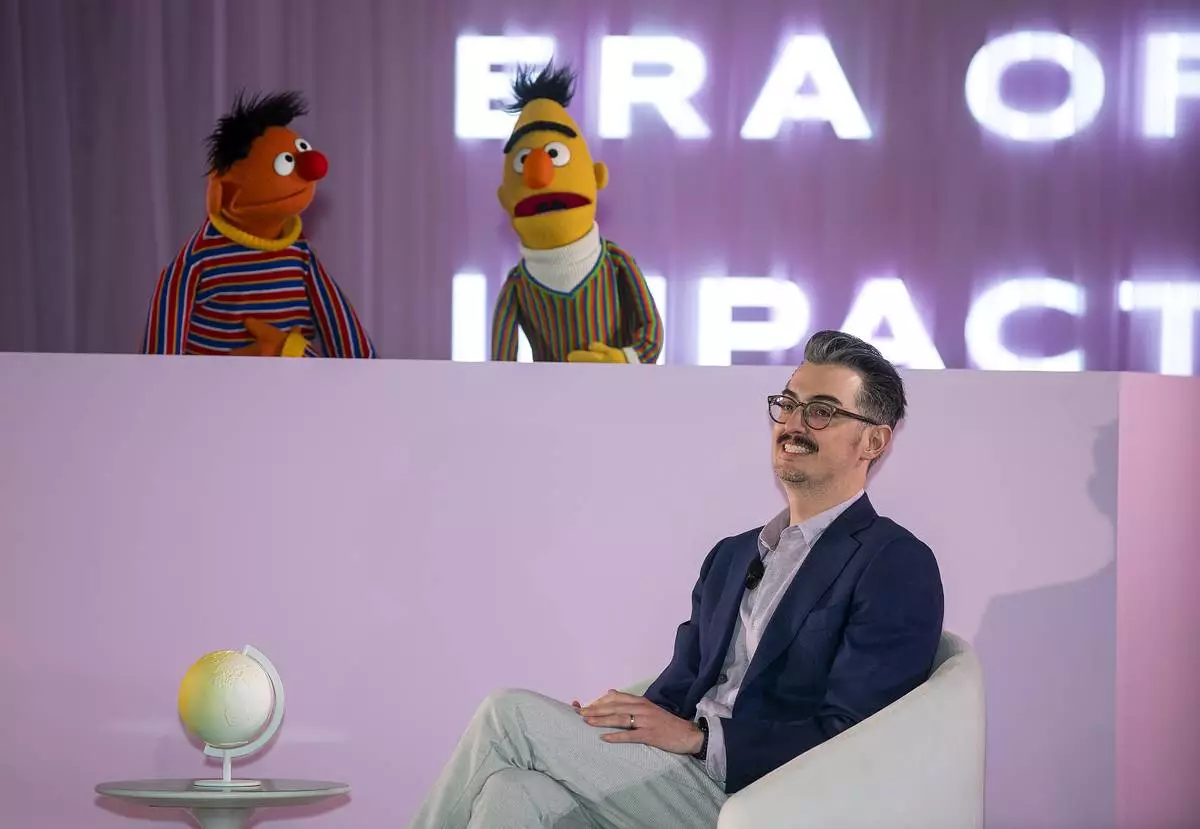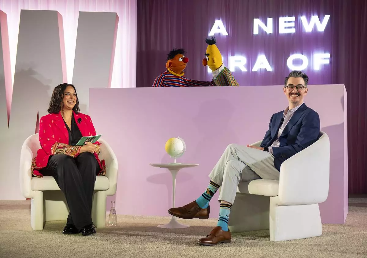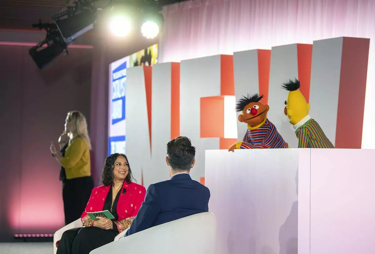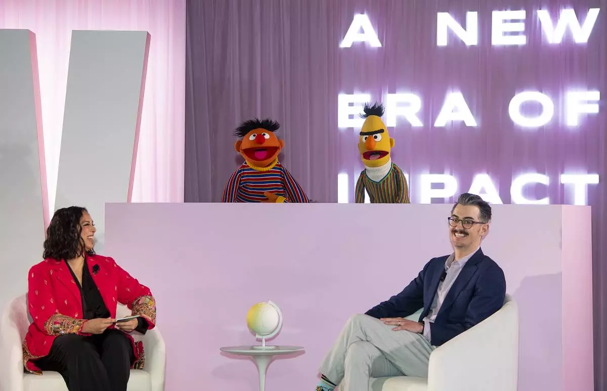 Sesame Street's Bert and Ernie speak with Sal Perez, executive producer and VP of Sesame Street at Sesame Workshop, after Sesame Workshop won the Elevate Prize Foundation's Catalyst Award, Wednesday, May 14, 2025, in Miami Beach, Fla. (AP Photo/Michael Laughlin)