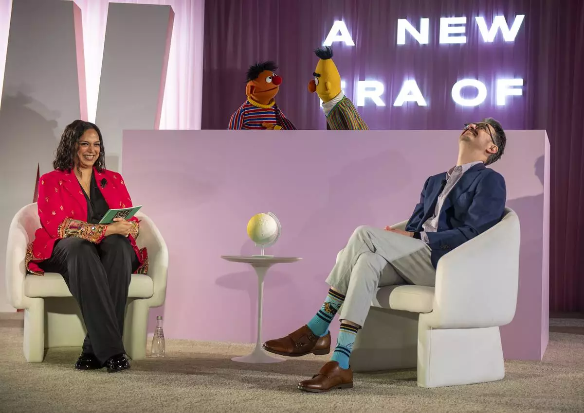Sesame Street's Bert and Ernie speak with Sal Perez, executive producer and VP of Sesame Street at Sesame Workshop, won the Elevate Prize Foundation's Catalyst Award, Wednesday, May 14, 2025, in Miami Beach, Fla. (AP Photo/Michael Laughlin)