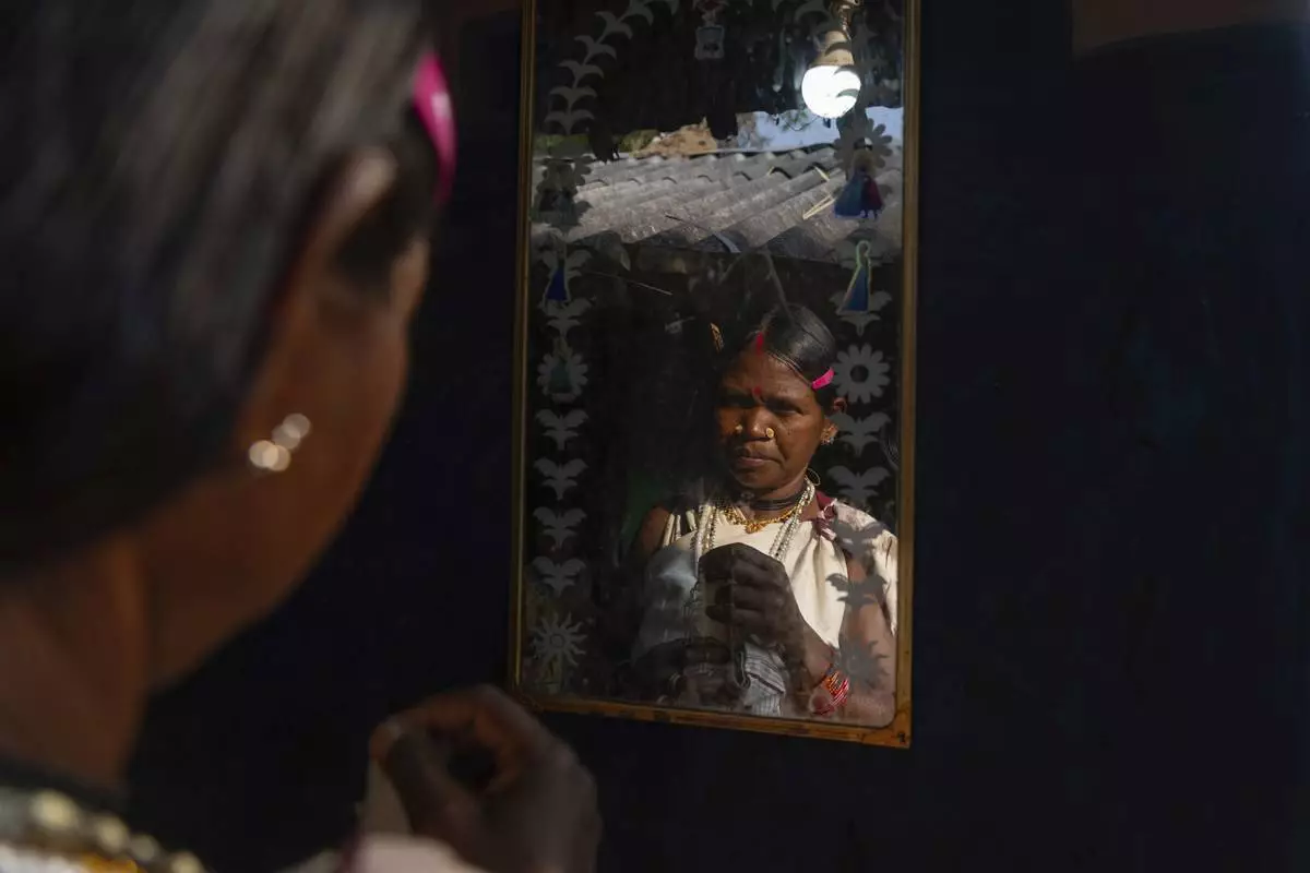 A woman, from the Durua Indigenous community, prepares to take part in the Chaitra Parab festival, a monthlong harvest celebration, in Hatipakna village, Koraput district, in India's eastern state of Odisha, Thursday, April 17, 2025. (AP Photo/Rafiq Maqbool)