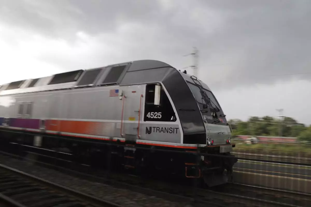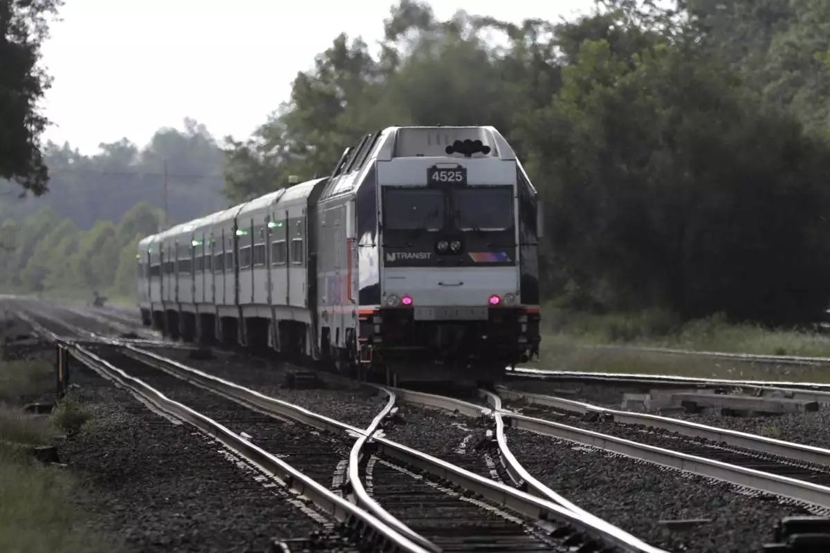 FILE - A New Jersey Transit train leaves the Bound Brook Station, Friday, Aug. 3, 2018, in Bound Brook, N.J. Commuters were faced with many train cancellations during the morning rush hour. (AP Photo/Julio Cortez, File)