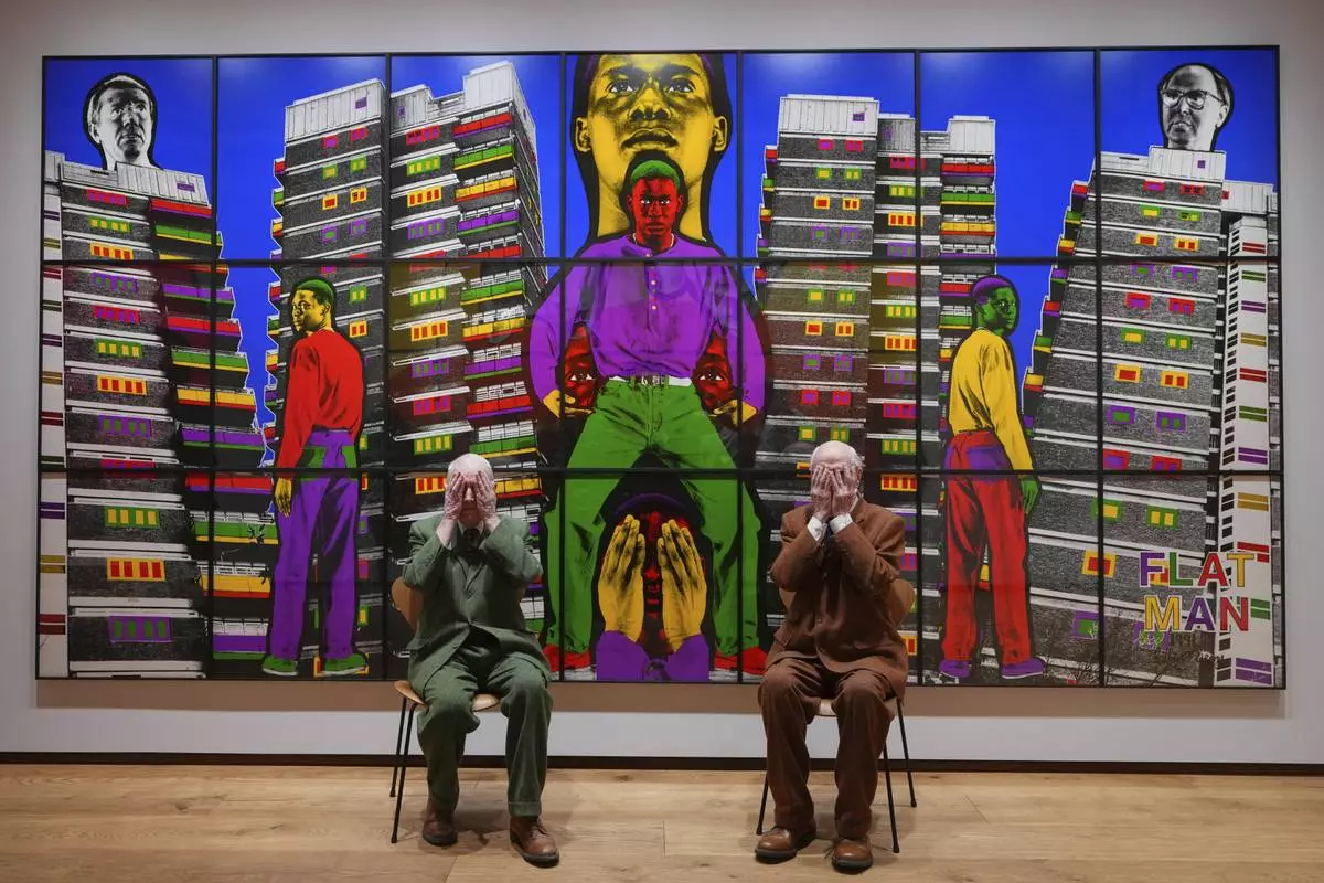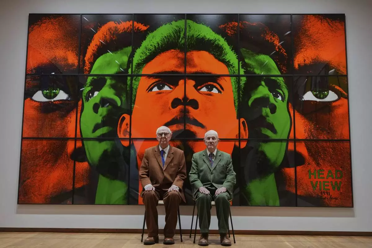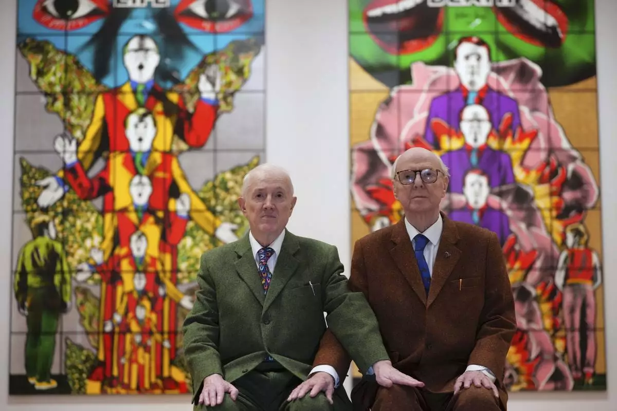 Art duo Gilbert & George pose with artwork at their exhibition called 'DEATH HOPE LIFE FEAR…' an exhibition of 18 pictures by Gilbert & George that span the years 1984 to 1998, at The Gilbert & George Centre in London, Wednesday, May 14, 2025. (AP Photo/Kirsty Wigglesworth)