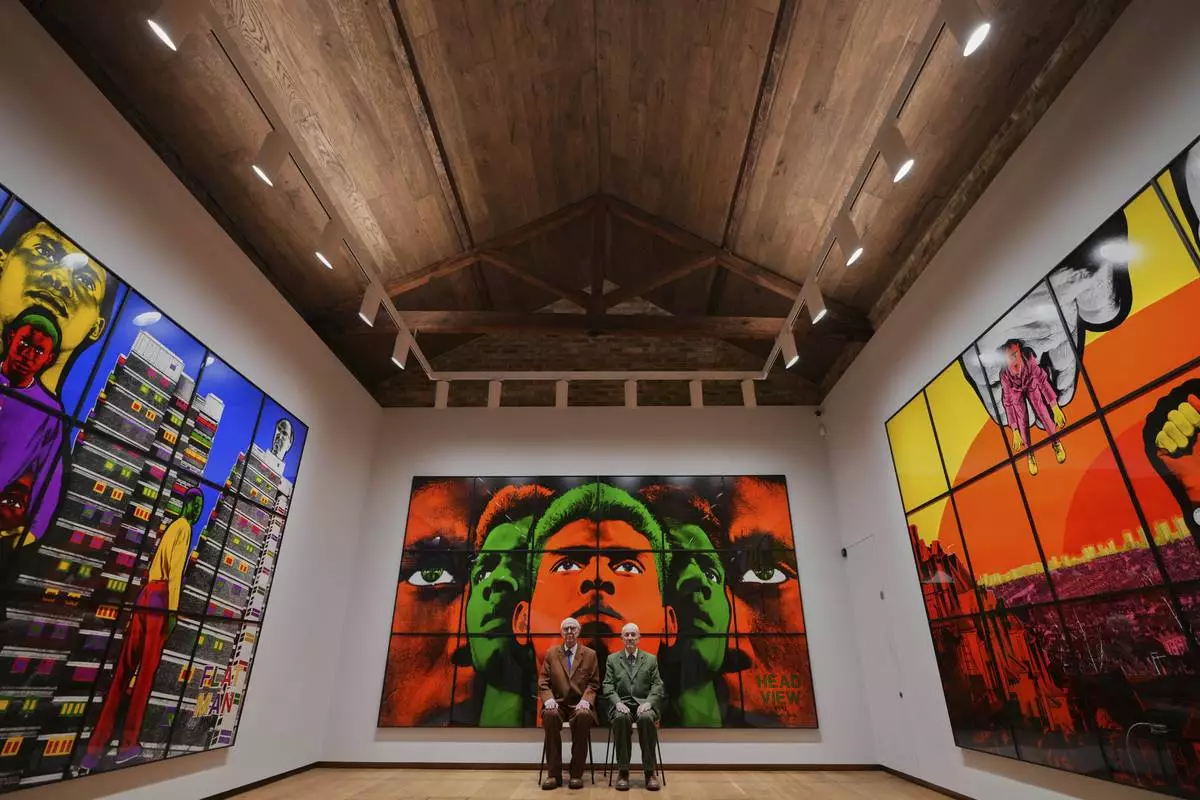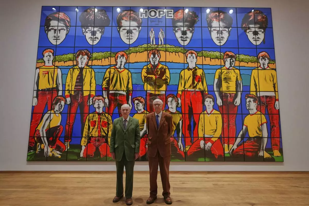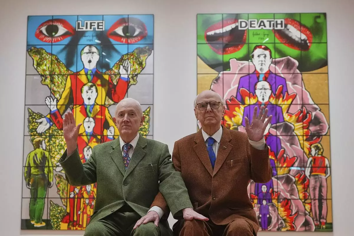 Art duo Gilbert & George pose with artwork at their exhibition called 'DEATH HOPE LIFE FEAR…' an exhibition of 18 pictures by Gilbert & George that span the years 1984 to 1998, at the Gilbert & George Centre in London, Wednesday, May 14, 2025. (AP Photo/Kirsty Wigglesworth)