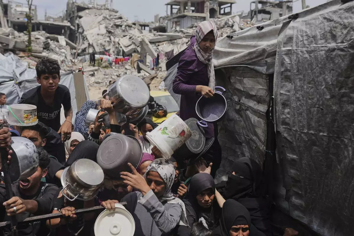 Palestinians struggle to get donated food at a community kitchen in Jabalia, northern Gaza Strip, Thursday, May 15, 2025. (AP Photo/Jehad Alshrafi)