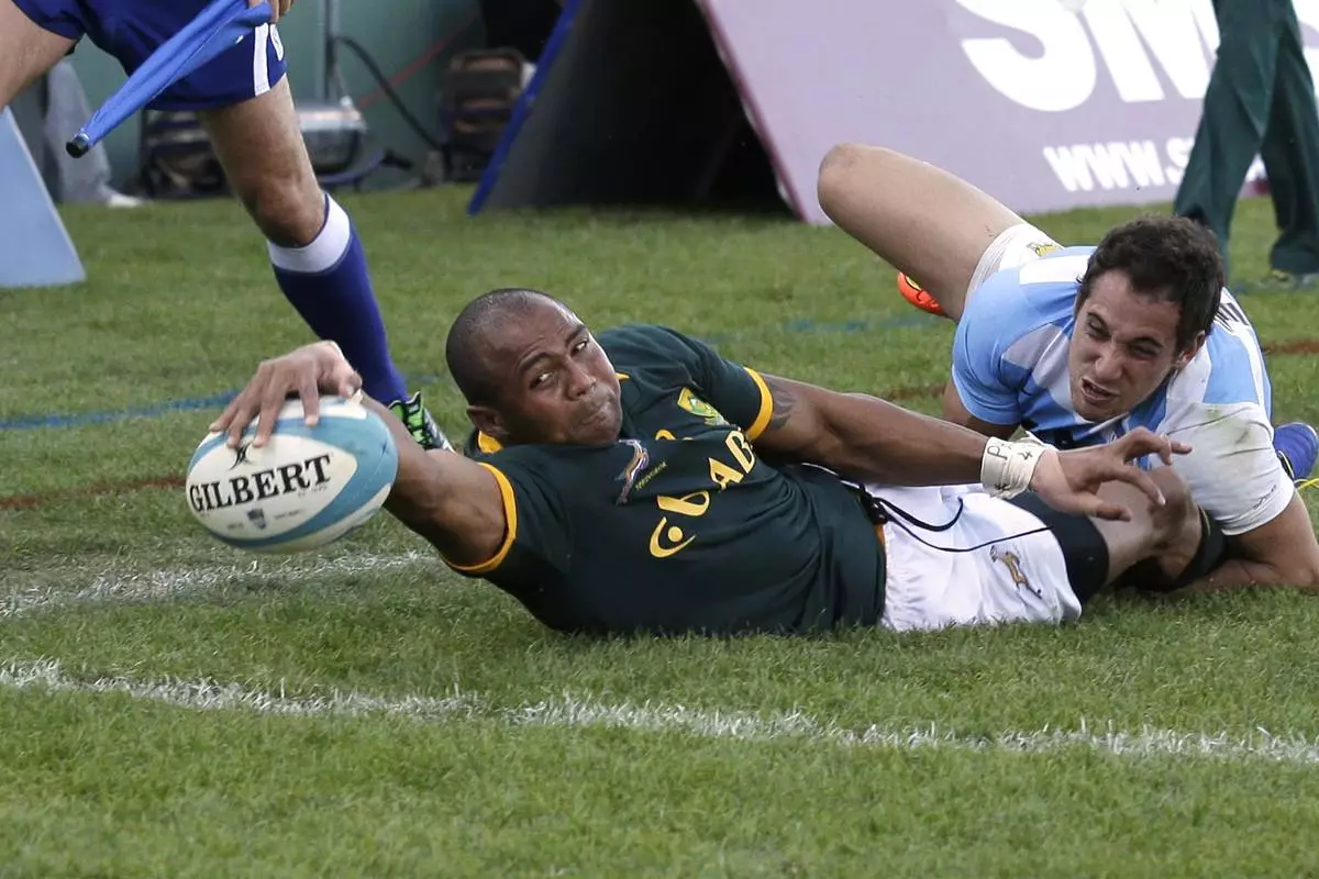FILE -South Africa's Cornal Hendricks, left, scores a try against Argentina as he is tackled by Argentina's Joaquin Tuculet during their Rugby Championship match in Salta, Argentina, Aug. 23, 2014. (AP Photo/Victor R. Caivano), File)