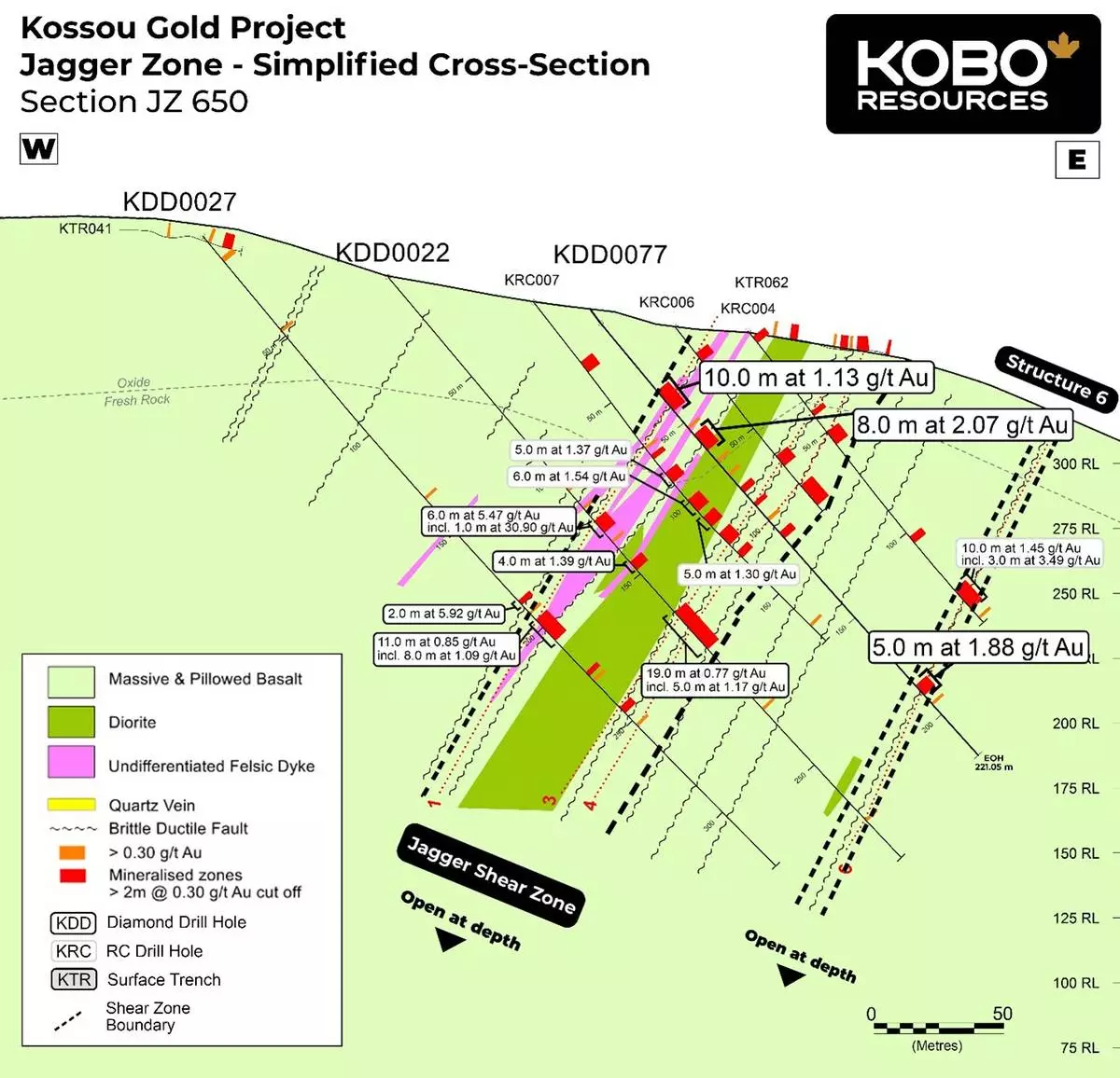 Drill hole KDD0077, completed on Jagger Section JZ650, was drilled to test the continuity of mineralisation between previously drilled in holes KRC006 and KRC007 ( see press release July 24, 2023 ). The hole successfully confirmed the predicted continuity of the Jagger Shear Zone and its associated gold-bearing structures. Notably, Jagger Structure 6 (“ JS6 ”) was intersected near the bottom of the hole, returned 5.0 m at 1.88 g/t Au, highlighting its potential as a significant but relatively underexplored gold-bearing shear zone. JS6 will be prioritized for additional drill testing in future phases. See Figure 2 for cross section JZ650. Detailed collar information and intercepts for all four holes are provided in Table 1.
