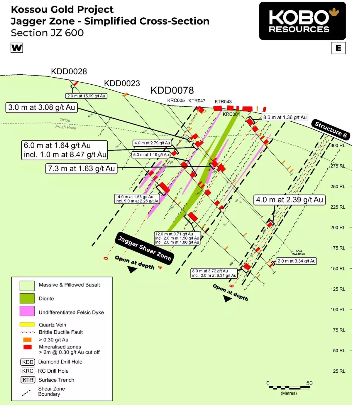 Edward Gosselin, CEO and Director of Kobo commented: “We continue to deliver strong results at our Kossou Gold Project. Our latest drill results strengthen our understanding of the continuity of gold mineralisation at the Jagger Zone and continue to validate the broader structural model we’ve been developing at Kossou. In addition, new intercepts indicate additional mineralisation in the footwall of the Jagger Shear Zone within “Jagger Structure 6” and additional drilling is warranted to further define this target.”
